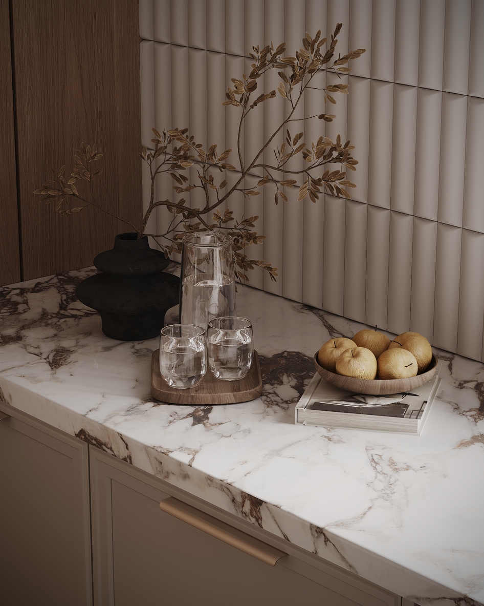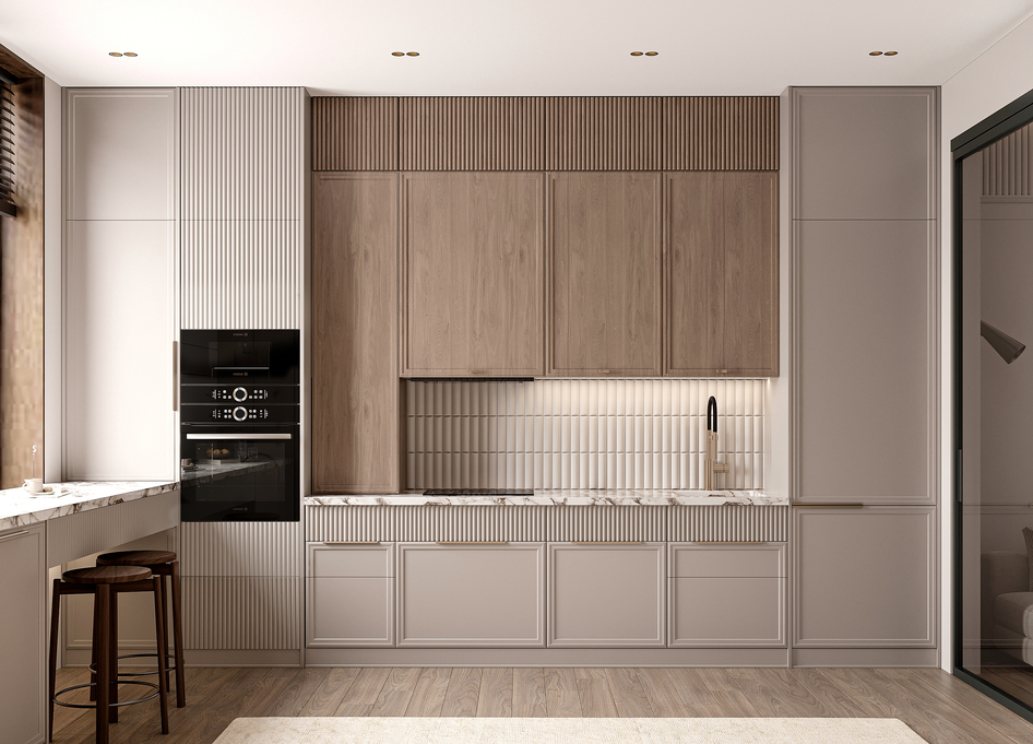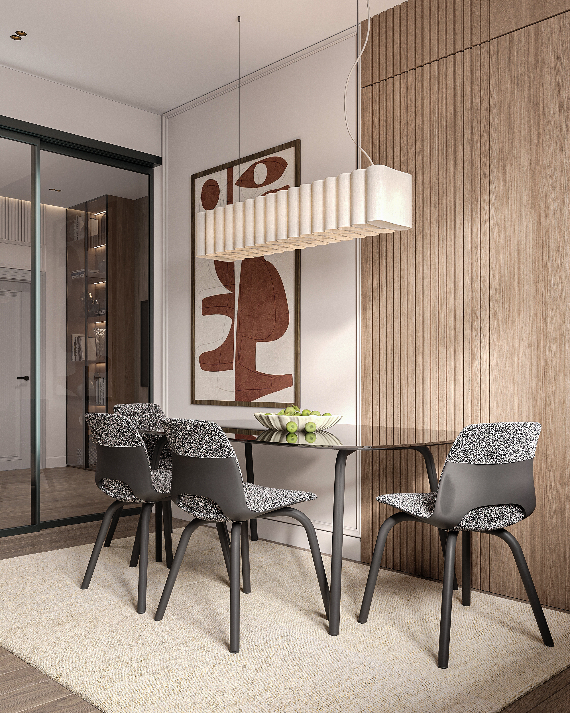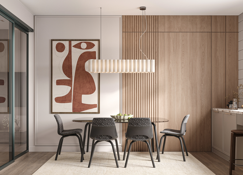 Современная обеденная зона в тёплых натуральных оттенках. Лаконичный дизайн, деревянные панели с вертикальной текстурой, стеклянный стол и мягкие стулья создают уютную и стильную атмосферу. Подвесной светильник подчёркивает зону стола, а декоративное панно добавляет интерьеру художественный акцент