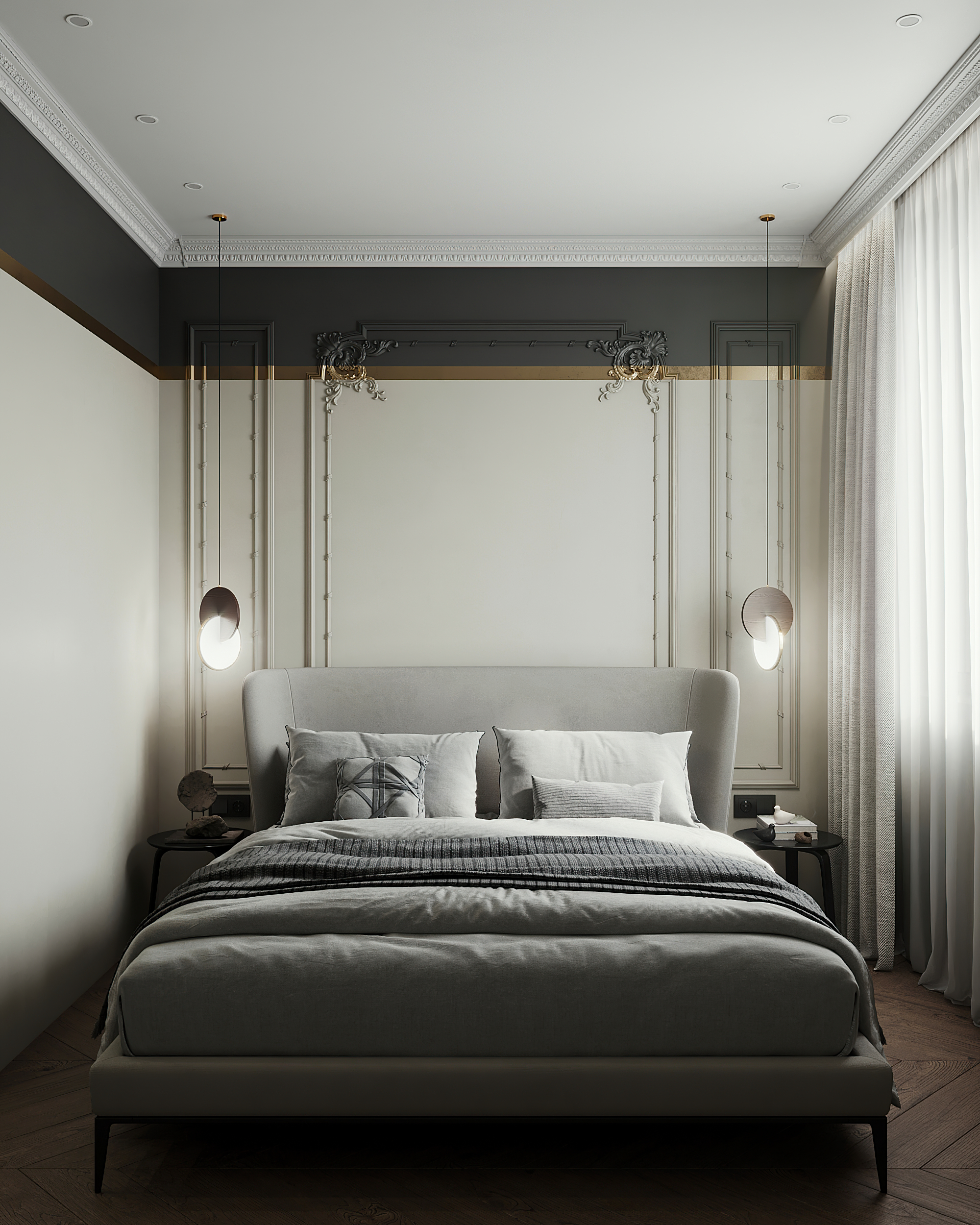 а что за такие элементы в уголках карнизов? и розетки - это в цвет стен какая-то коллекция или чисто для концепции в цвет покрасили?