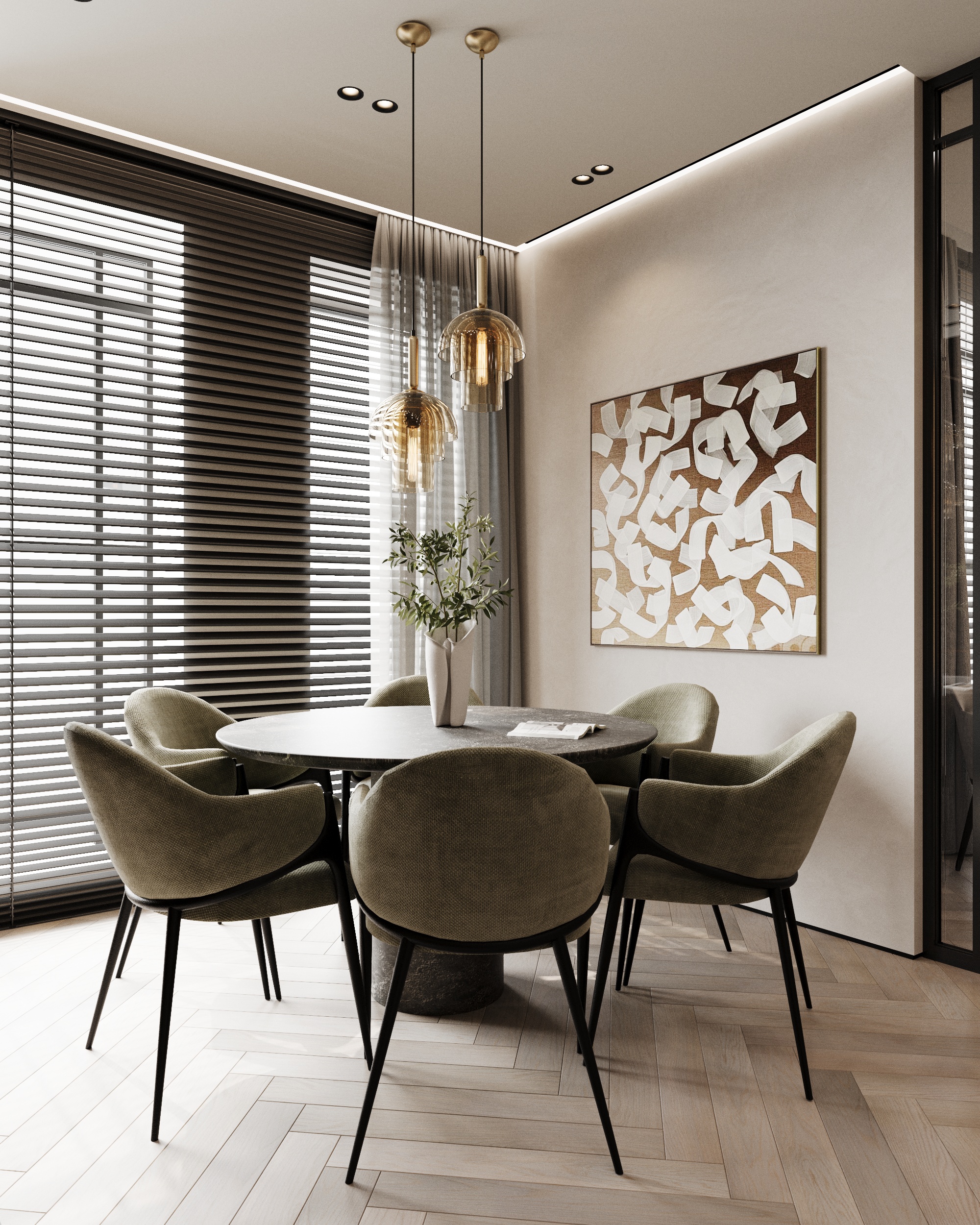 Интерьер выполнен в современном стиле с элементами минимализма и скандинавского дизайна