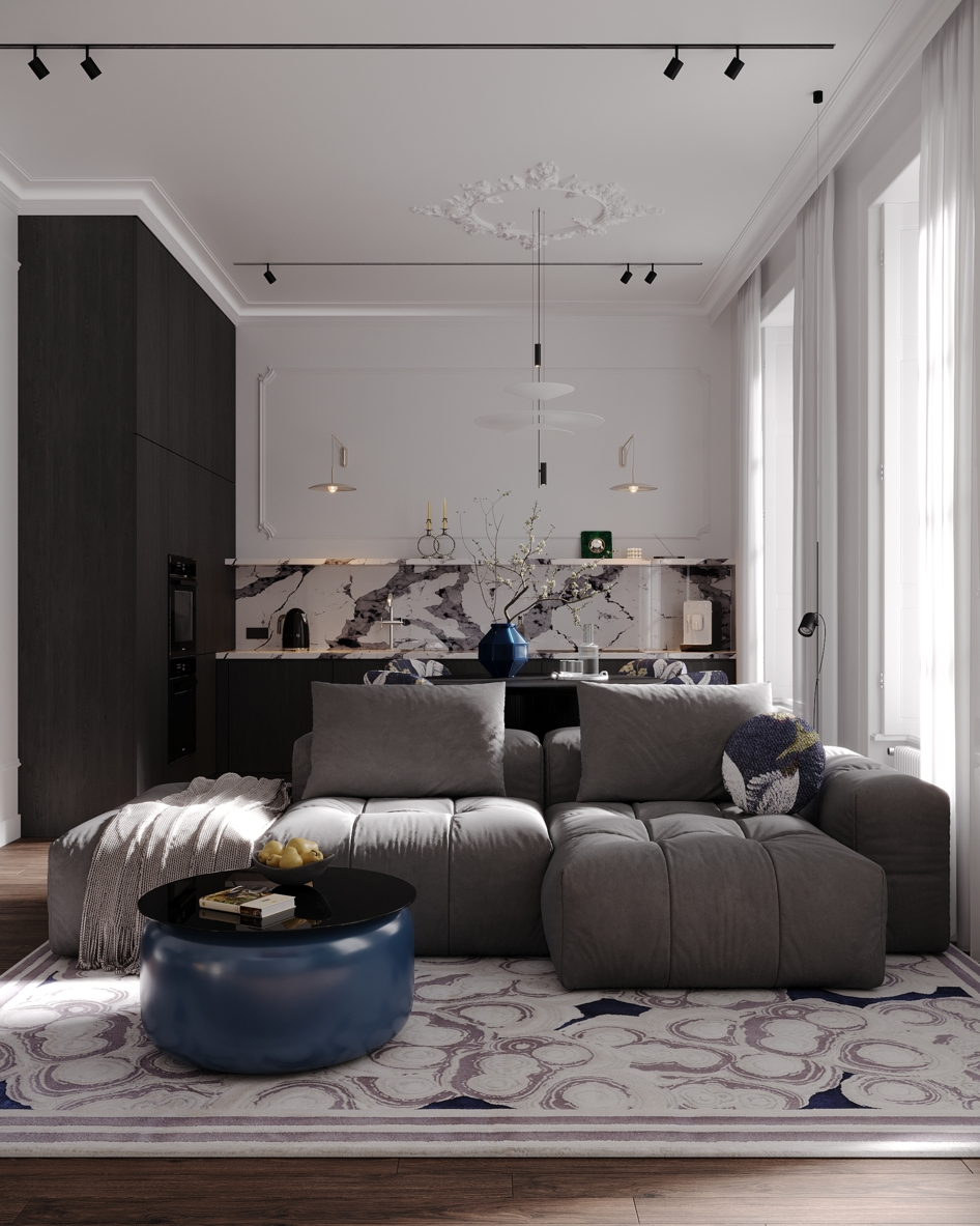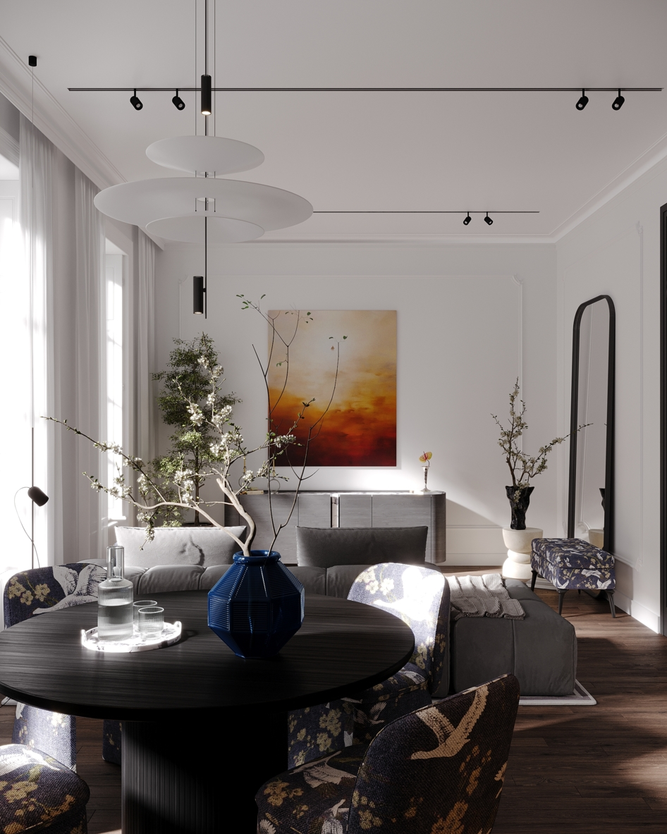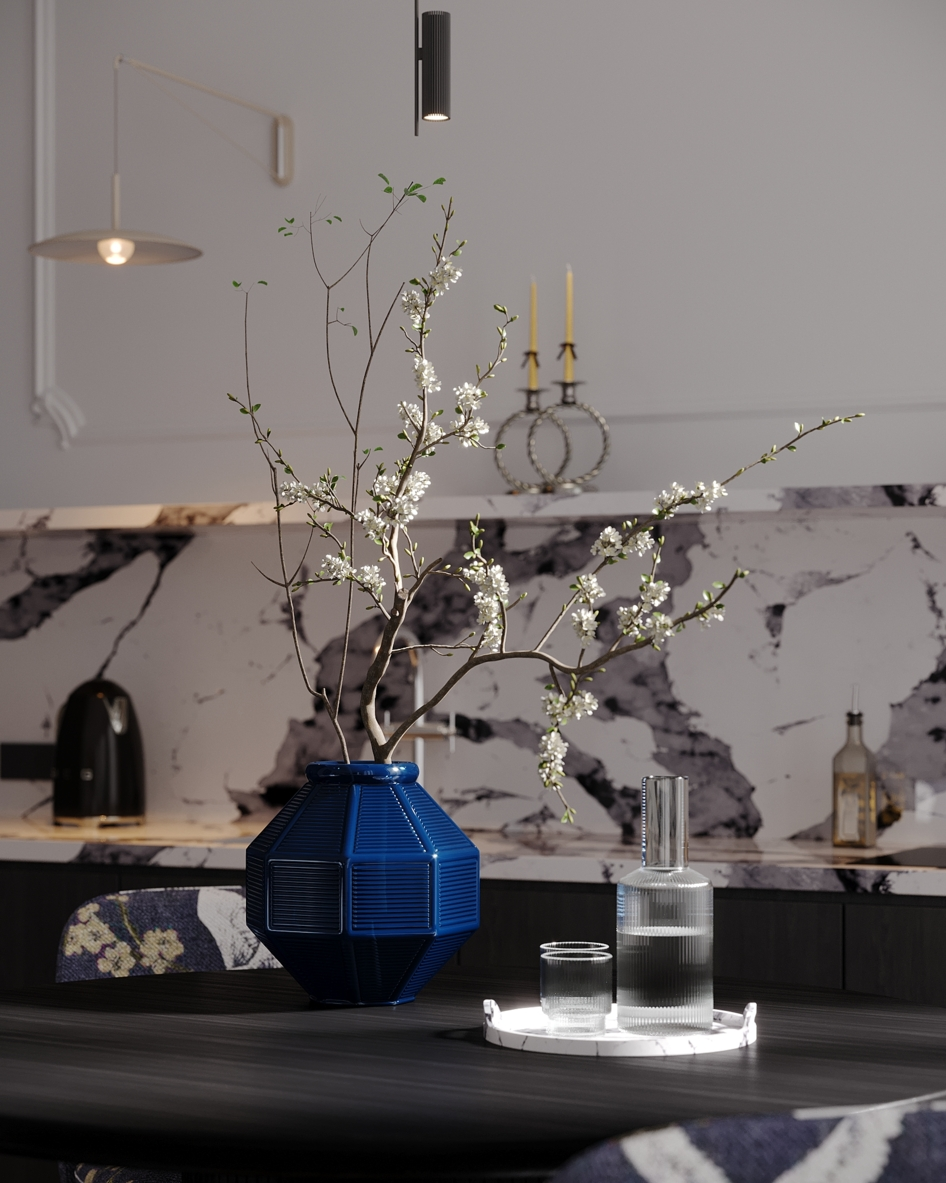 Этот синий цвет и обивка у стульев в самое сердечко))
