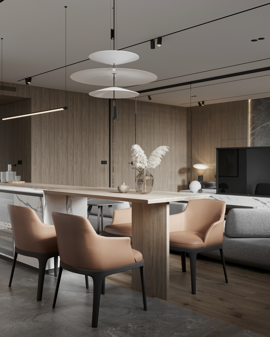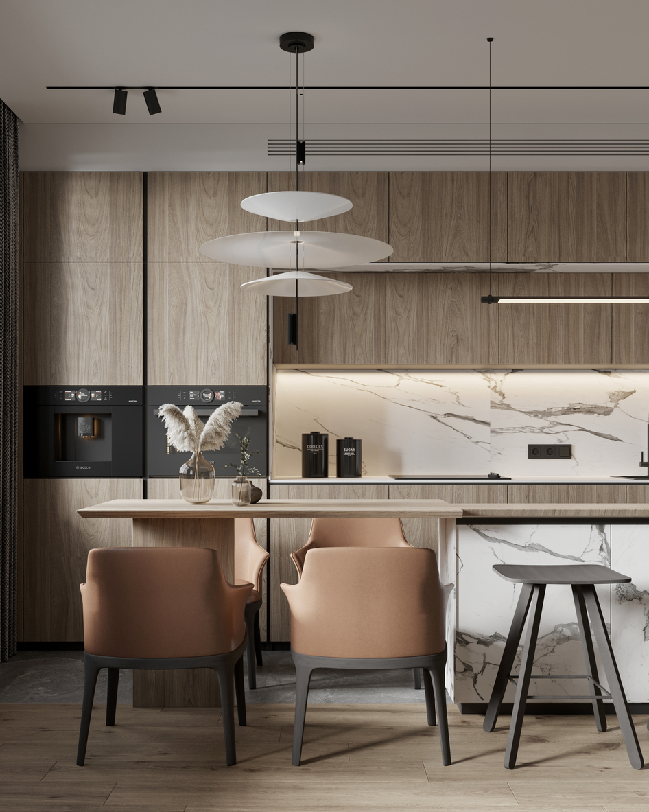 Интересно, как у вас так получается, что за одной высотой столешницы- у вас стоят полубарные стулбя и простые. Простые- явно здесь не к месту. А виз неплохой.