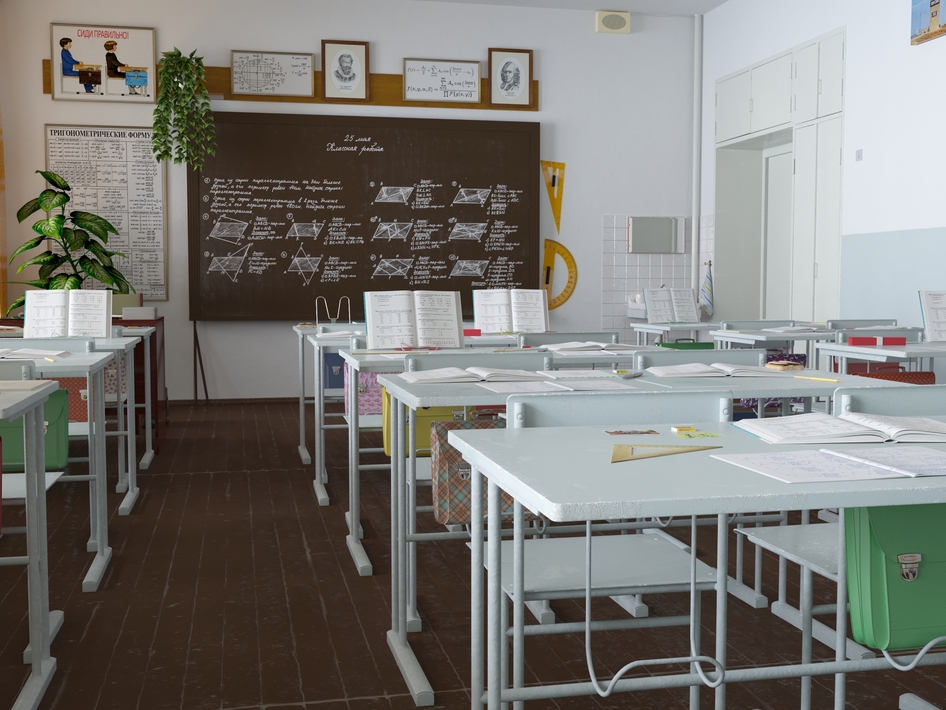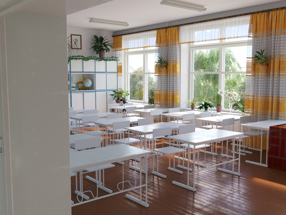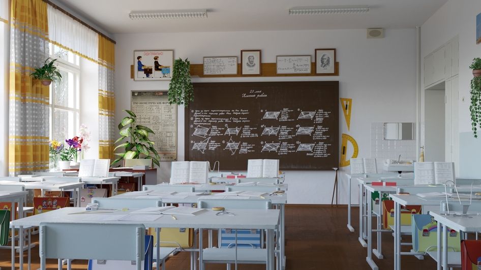 все отлично, но вот парты мне кажется должны быть грязно-голубого цвета. И снизу где портфель краска должна быть стерта, там где ноги всегда ставят. Береза в окне - обязательный атрибут любого школьного окна выше 2го этажа. ))