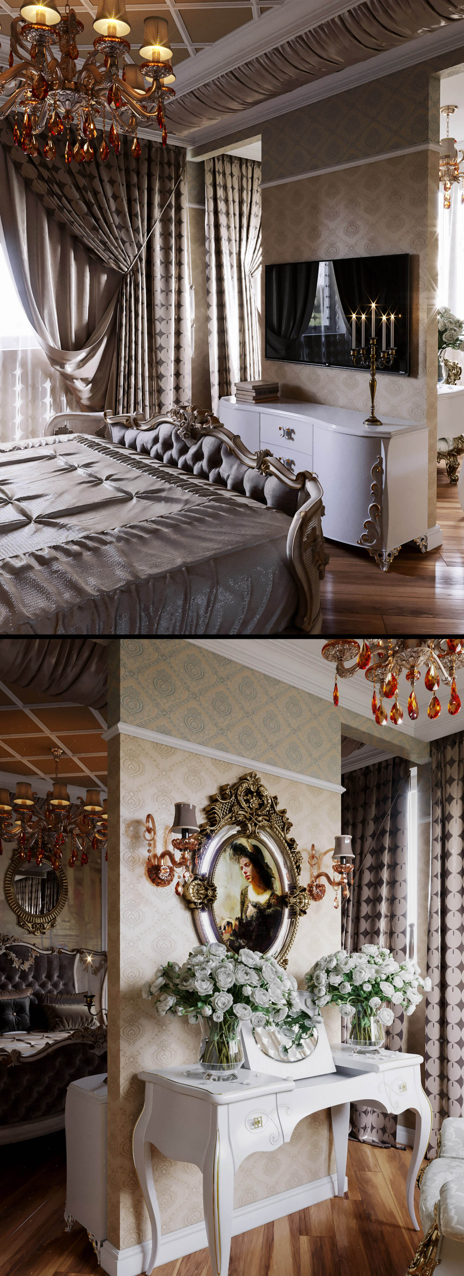 Как-то ракурсы все зажаты. Понятно, комнатка очень маленькая, но надо было выкручиваться, камеру дальше, вытягивать немного перспективу. Про молдинги уже сказали. Визуализация местами крутая, натуральная, а местами с материалами что-то не то, как пастеризация какая-то. Возможно деноиз?