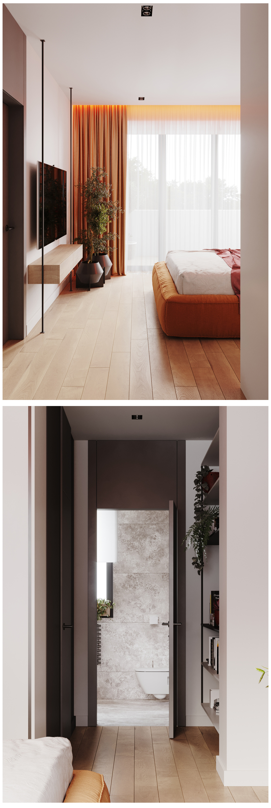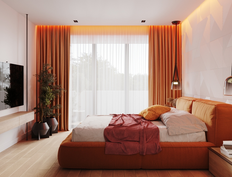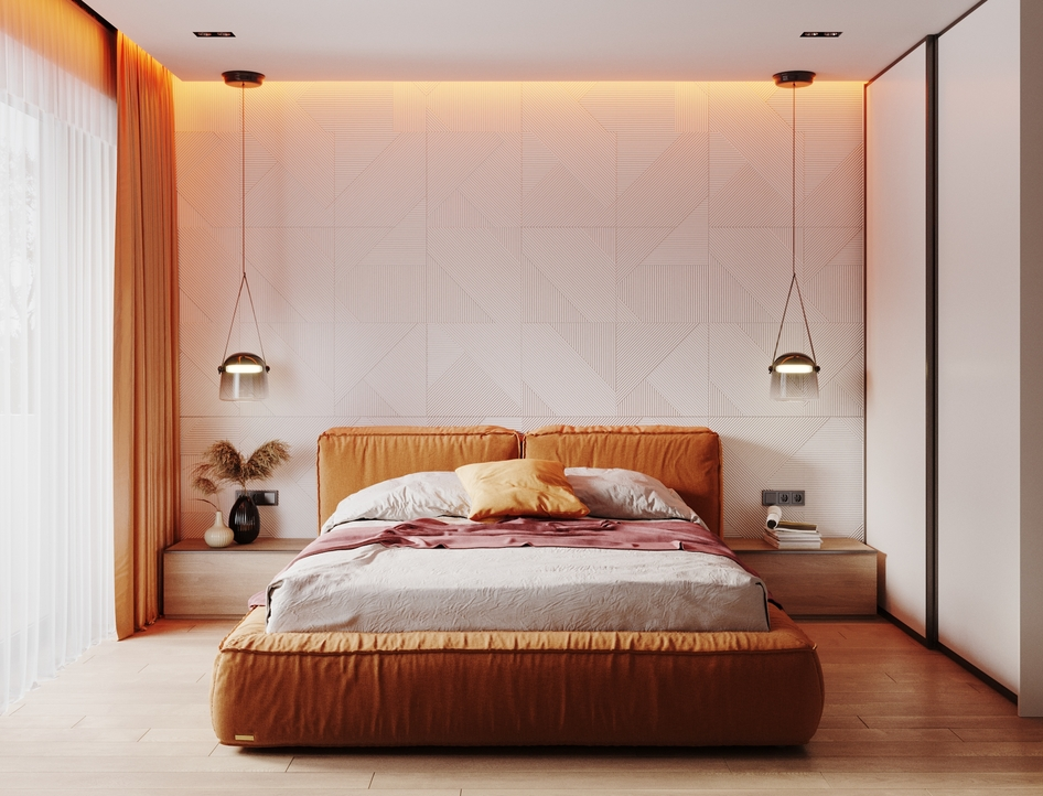 цвет красивый настроение норм, много лишних элементов , железные стойки по бокам от тумбы под тв не в тему пристенные панели за кроватью не в тему , перебамплено местами , огромный цоколь у ламп подвесных над кроватью дешевят интерьер, шкаф купе деревенский такие уже устарели ) этого освещение потолочного будет очень не хватать , но это все субьективно , я и сам колхозан еще тот