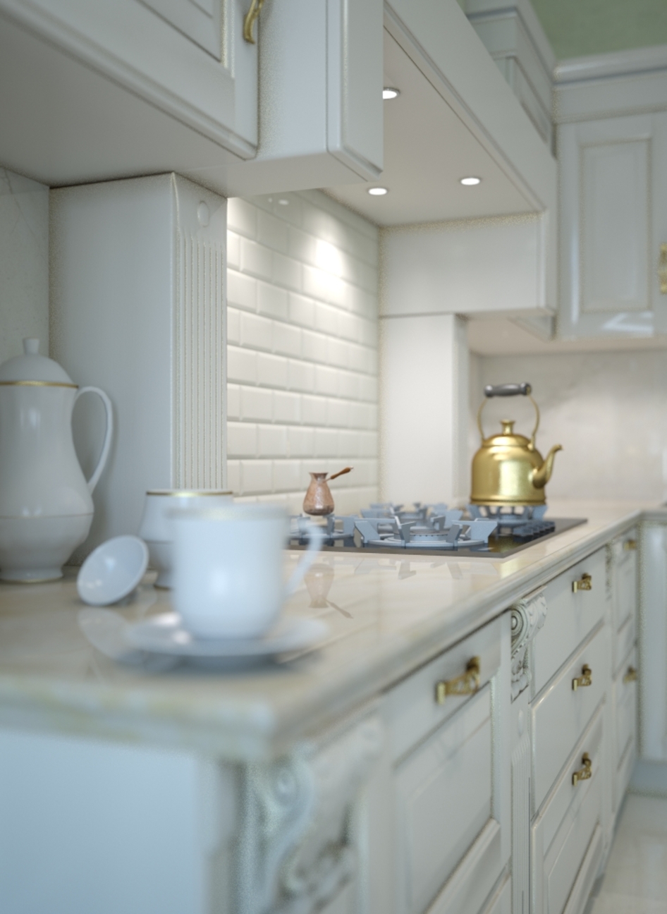Картинка то приятная.. доф слишком жёсткий, как-будто вручную делался или с помощью физической камеры. Летающая кофеварка, мат конфорок не нравится... Золотой чайник?