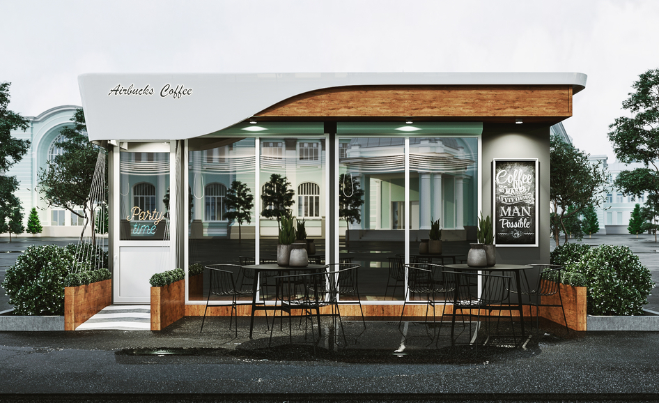 По дизайну есть интересные моменты. Но низя так вывеску главную принижать размером))) Входная группа классно выделена вазонами, правда, людям там сложно будет разойтись. От лужи хорошо бы избавиться деревянным настилом при реализации)
