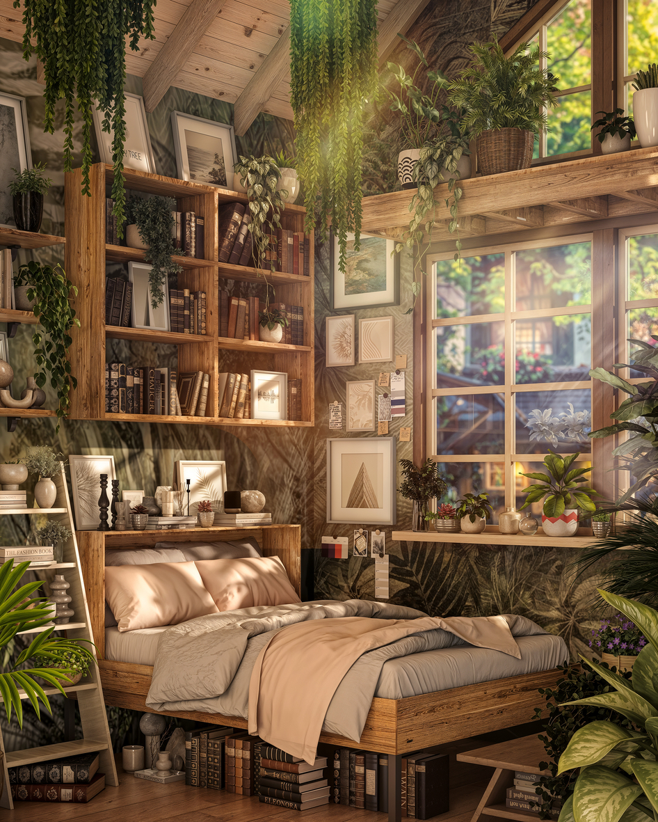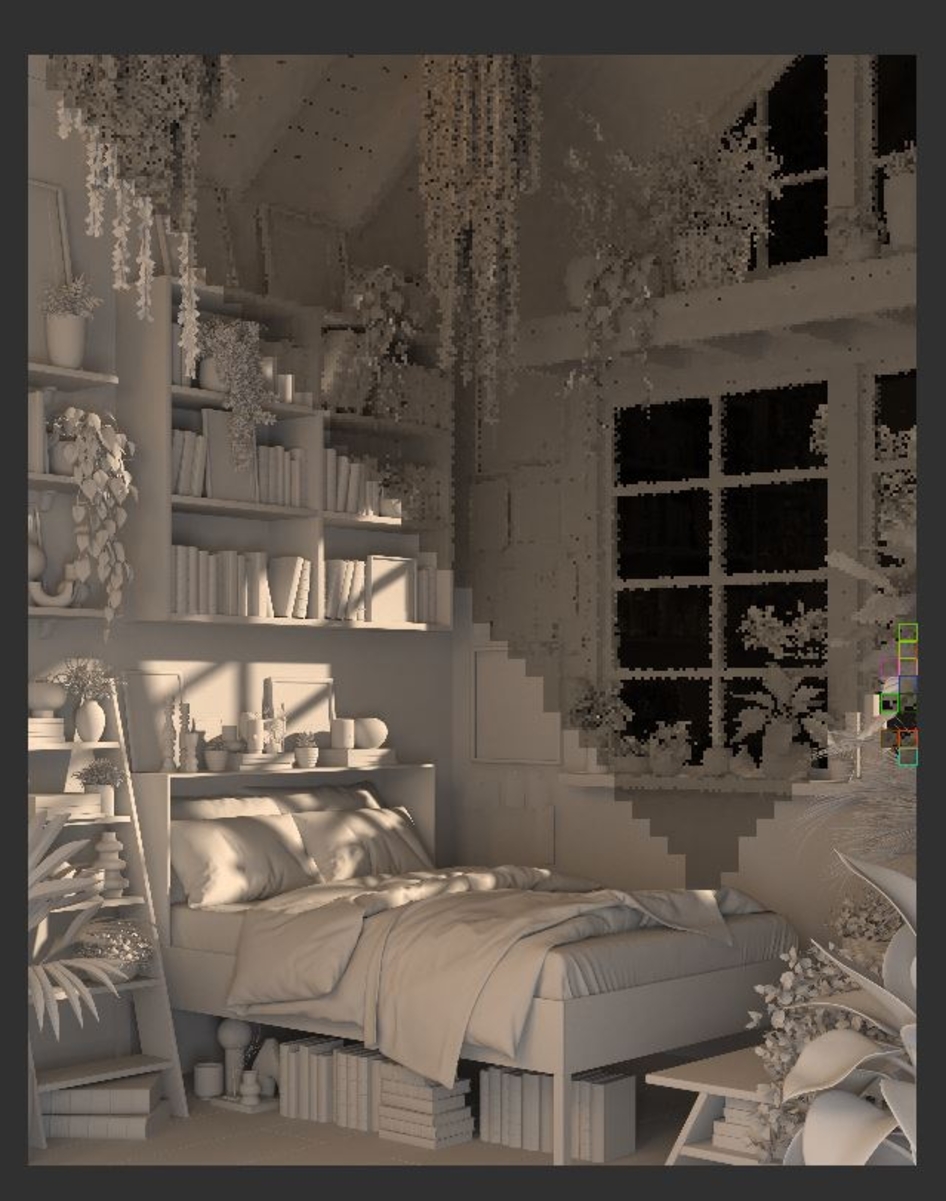 Классная композиция) Я бы ещё сделал постельное бельё не однотонное, а каким-нибудь принтом тоже интересным, или меховых бы элементов вкинул на кровать, или вязанных. Можно ещё кота спящего положить. Но в целом здорово конечно)