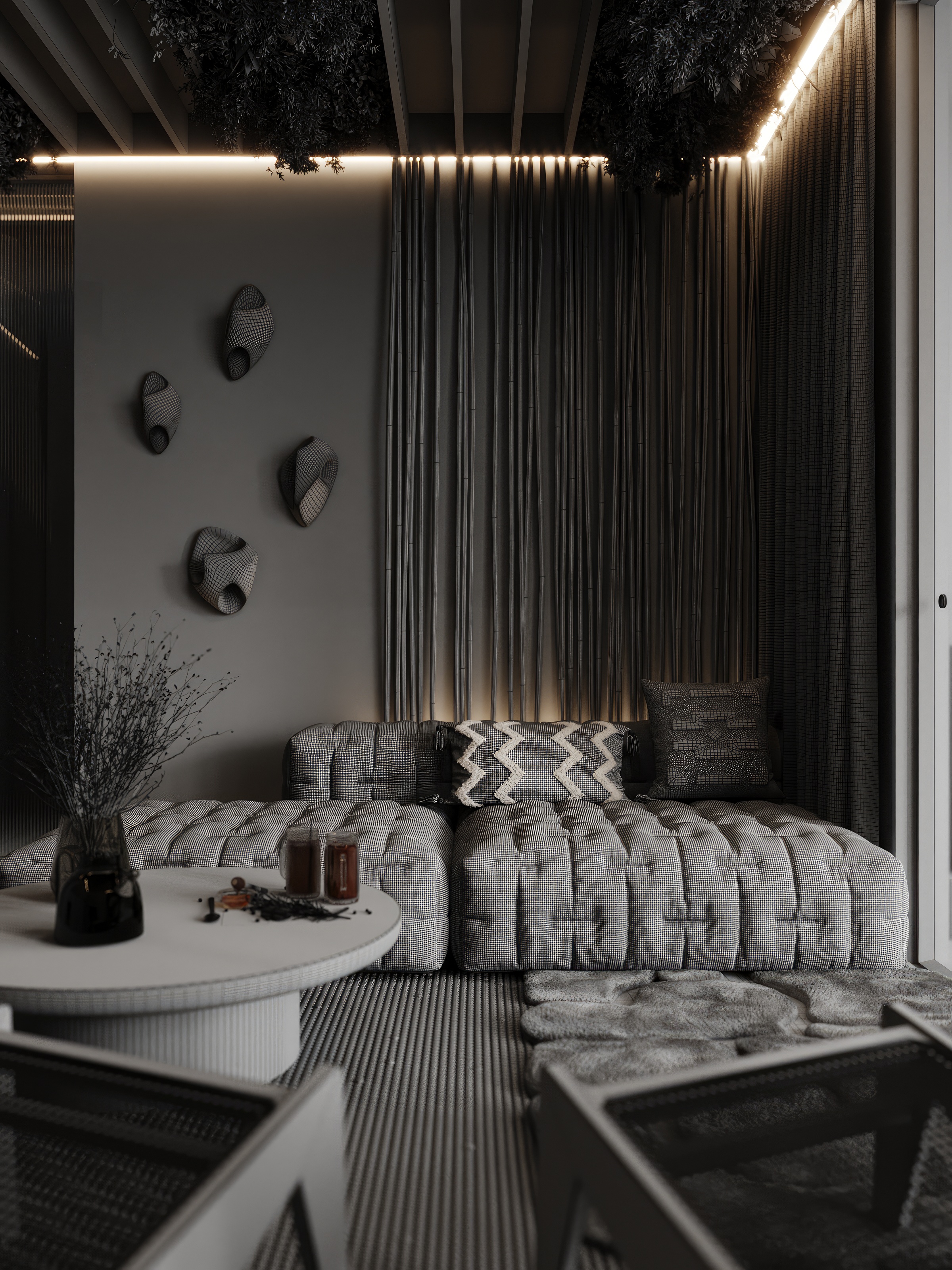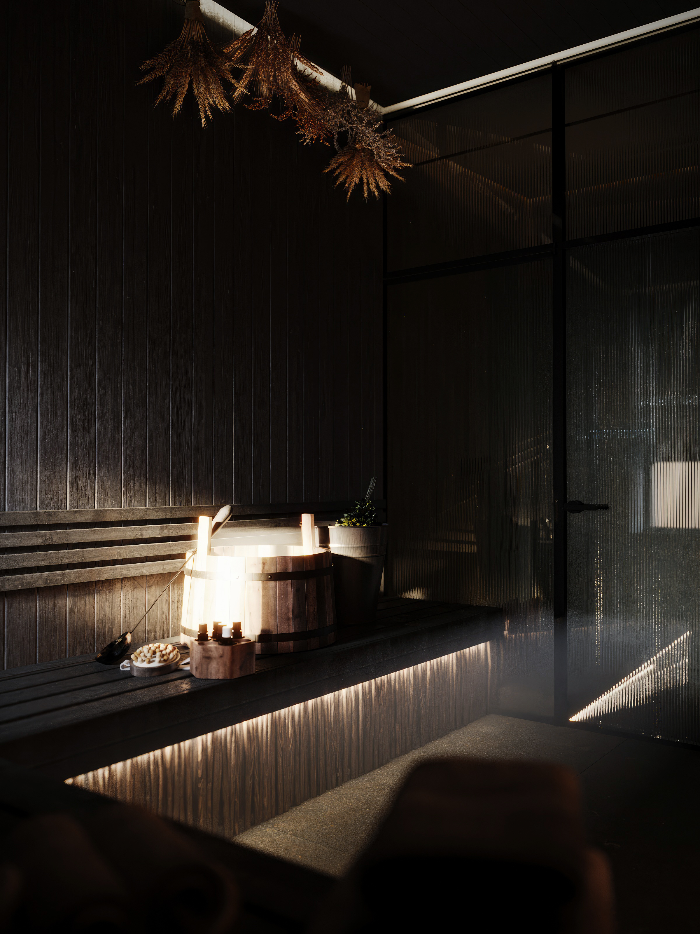 Зона отдыха, включающая в себя душевую и парную (Опережая вопросы^ на потолке в душевой липовый лык, заказчикам предоставлен подвариант и без него, и в другом цветовом решении, но это уже отдельный пост :) )