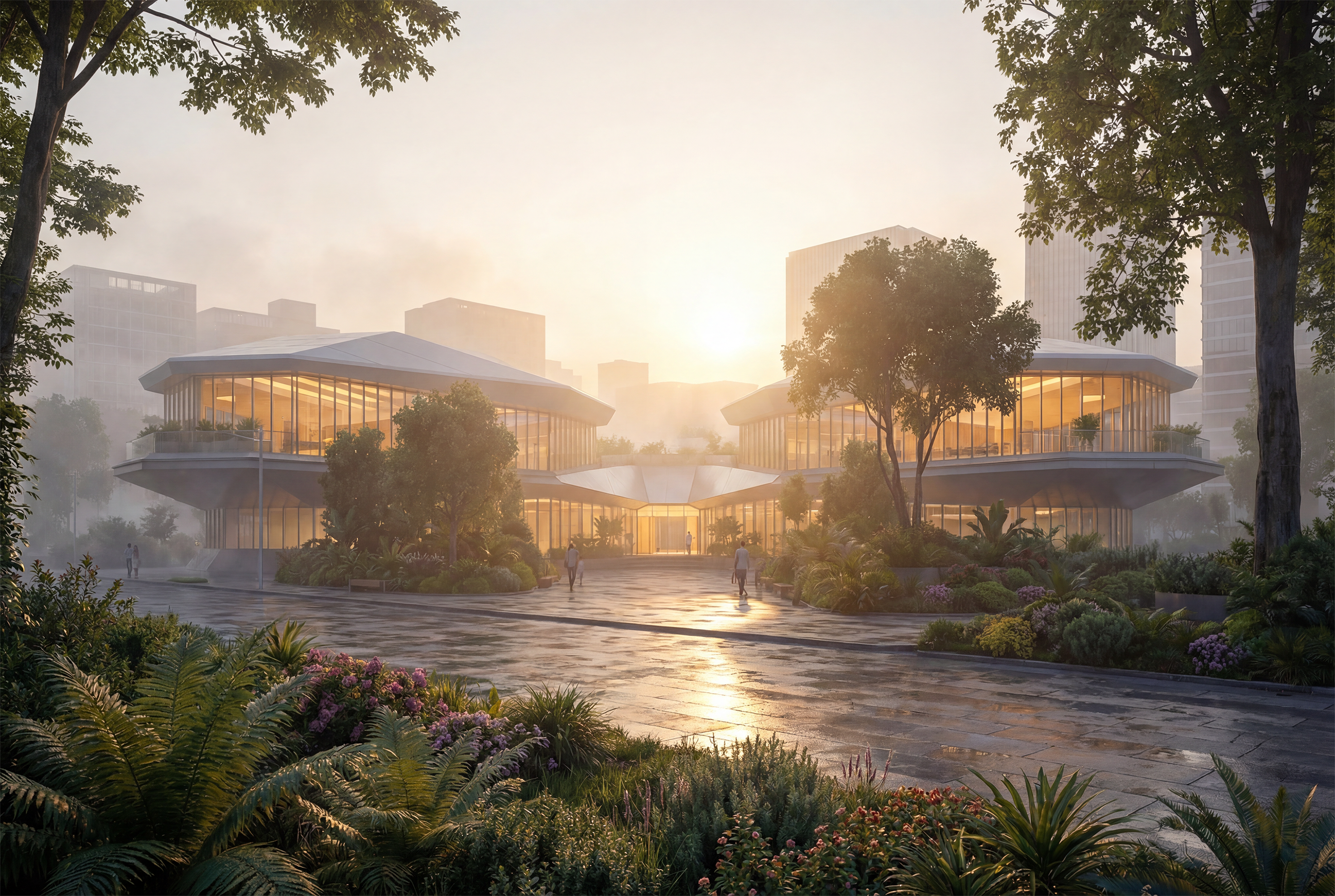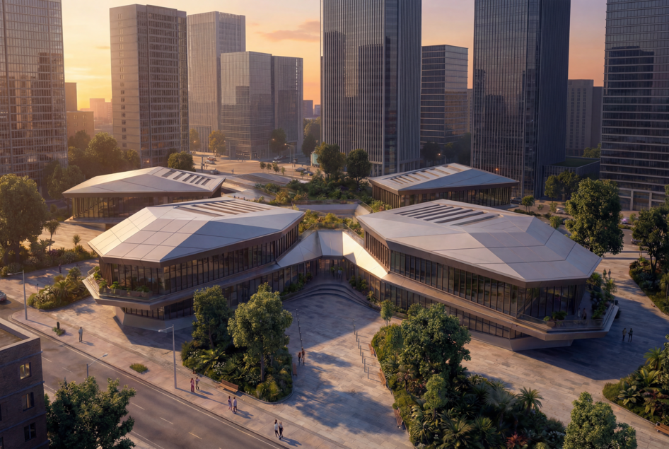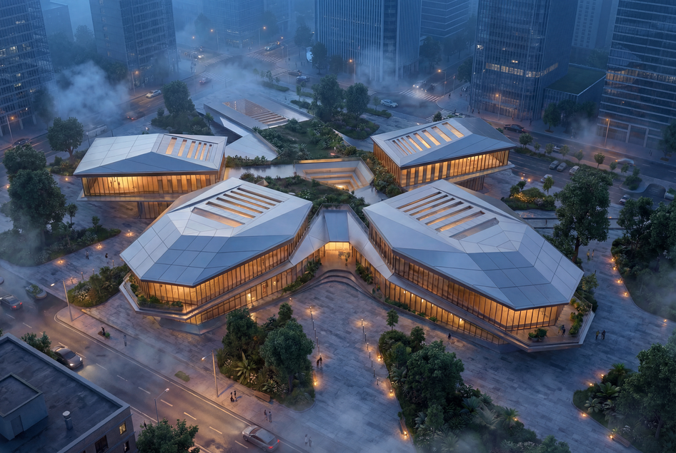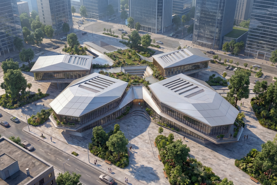 Концепция представляет собой комплекс, состоящие из 4-х блоков, отвечающих за коворкинг, общественное питание, спорт и библиотеку, объединенных единым рекреационным ядром