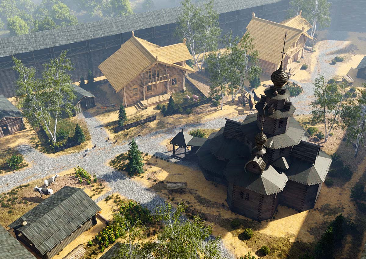 Домики жёлтые, кстати, скорее всего не правильные. Раньше дома делали двухуровневыми, чтобы на первом этаже был сарай и "гараж". В отдельных зданиях были бани и дровянники. А "мансард" не было - под крышей сушили всякое. На второй этаж вела высокая лестница, а на первый входили сбоку, со двора (которого почему-то нет). Нарисованы же какие-то современные коттеджи. И ещё у них нет труб. Газовое отопление, не иначе )