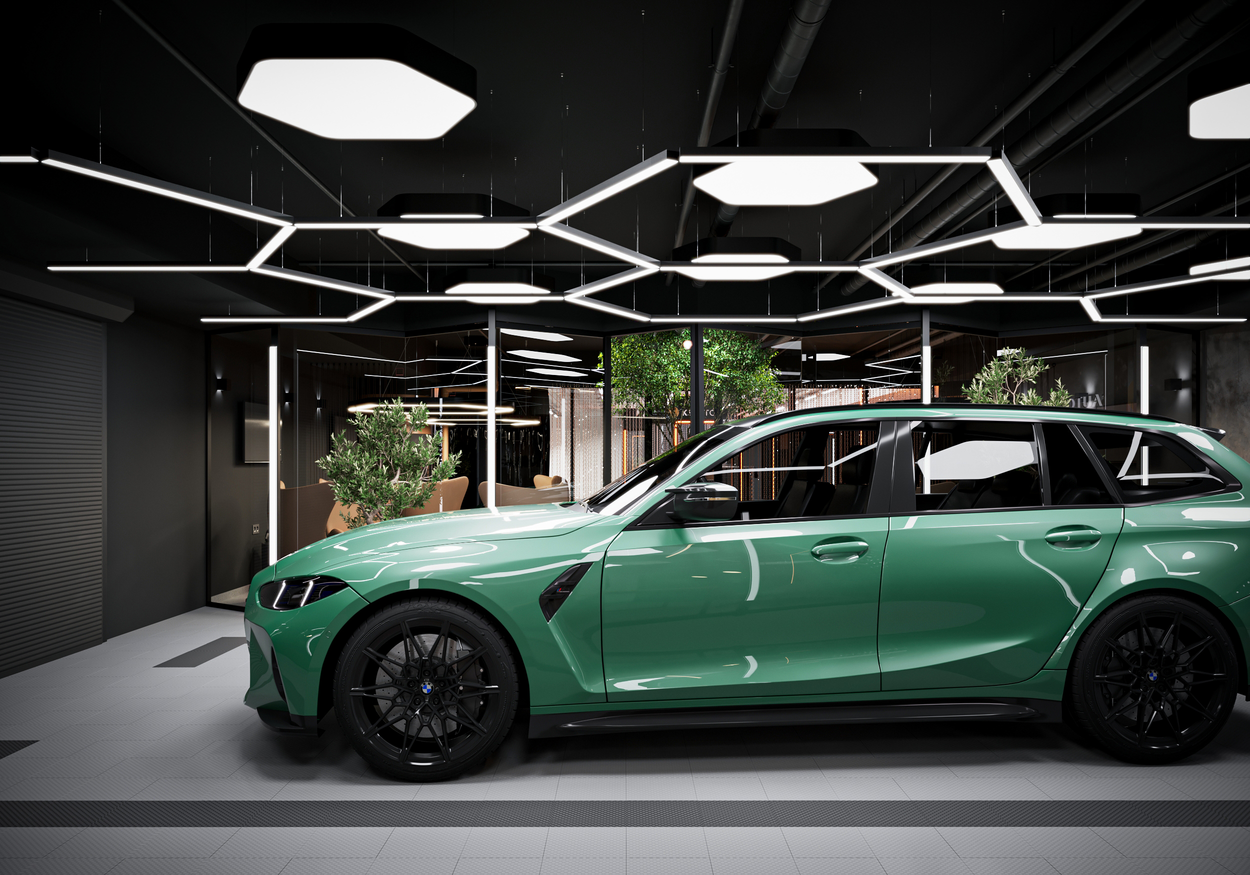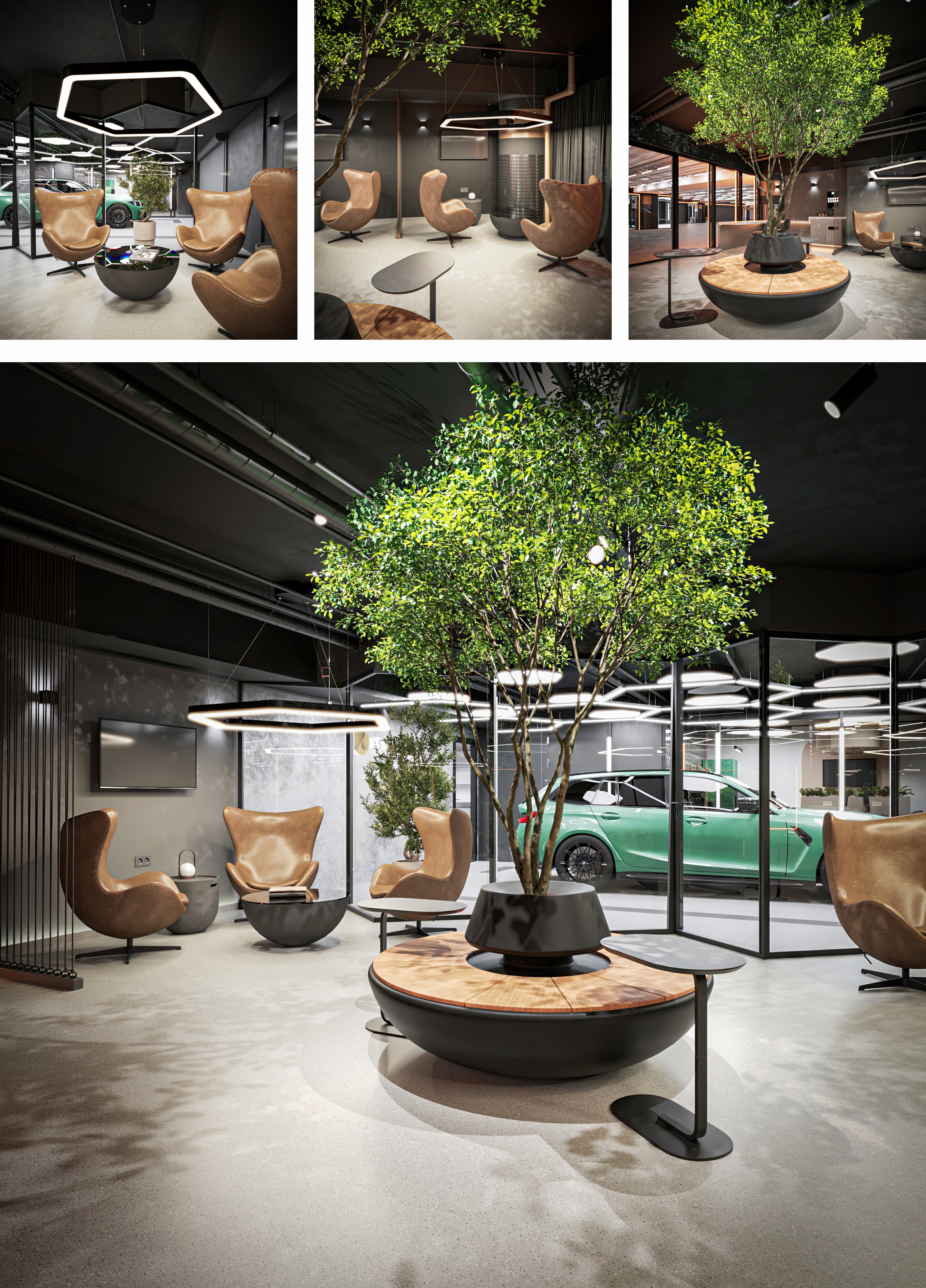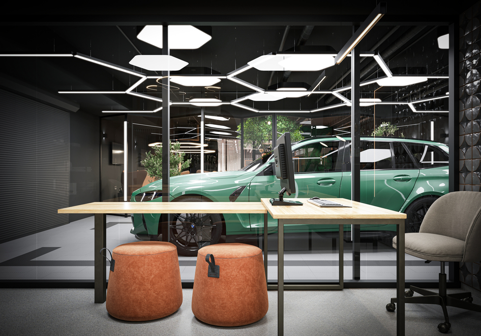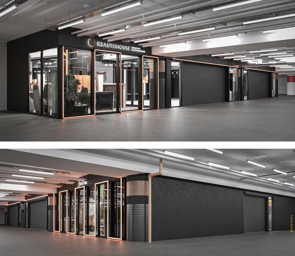 Проект KS AUTOHOUSE стал одним из самых заметных кейсов на рынке детейлинга Санкт-Петербурга. Локация: центр Санкт-Петербурга, ТЦ ТК «Невский Центр», паркинг-этаж P2.Проект запустился в 2022 г. и в 2023–2024 гг. KS AUTOHOUSE расширил зоны детейлинга и клиентской. Дополнительно было арендовано ~389 м² KS AUTOHOUSE предлагает не просто уход за автомобилем, а полное сопровождение владельца: от мойки и полировки до персонального консьерж-сервиса. Медийная составляющая усилилась благодаря сотрудничеству с блогером Булкиным, который стал амбассадором бренда. Это дало KS AUTOHOUSE узнаваемость в digital-среде, приток клиентов из автомобильного комьюнити и статус «детейлинг-центра нового поколения».В дизайне интерьера отражена философия бренда: чистота, технологичность, престиж. Офис и демонстрационная зона построены на контрасте индустриальной среды и ощущения уюта: тёплый свет, зелёные акценты, сухие текстуры и архитектурная строгость создают атмосферу доверия и премиальности. Так как помещение лишено естественного света, зелёные акценты стали ключевым приёмом. Они компенсируют отсутствие природы, вносят ощущение свежести, смягчая технологичную атмосферу пространства. Живая зелень превращает индустриальный бокс в комфортную и визуально тёплую среду для клиентов и сотрудников. Заказчик самостоятельно подбирал цвета без авторского надзора, поэтому предпочтение было отдано нейтральным, безопасным оттенкам — серому, графитовому и белому. Такой монохромный диапазон не только универсален, но и оптимален для работы с автомобилями: он не создаёт лишних бликов и отражений на кузове, не искажает восприятие цвета лакокрасочного покрытия. Кроме того, интерьер регулярно становится фоном для фото- и видеосъёмки контента детейлинг-центра, поэтому исключены яркие и пёстрые текстуры. Нейтральная палитра подчёркивает чистоту и точность формы автомобиля, сохраняя визуальный фокус на главном объекте — самом автомобиле. В процессе реализации владельцы внесли ряд изменений. Вместо запланированных кожаных кресел Egg Chair в клиентской зоне установлены массажные кресла для посетителей. На территории консьерж-сервиса есть небольшой кабинет для директора и менеджеров. Версия кабинета, представленная на сайте, отличается от реализованного объекта и отражает скорее концепцию, показывающую потенциал помещения.