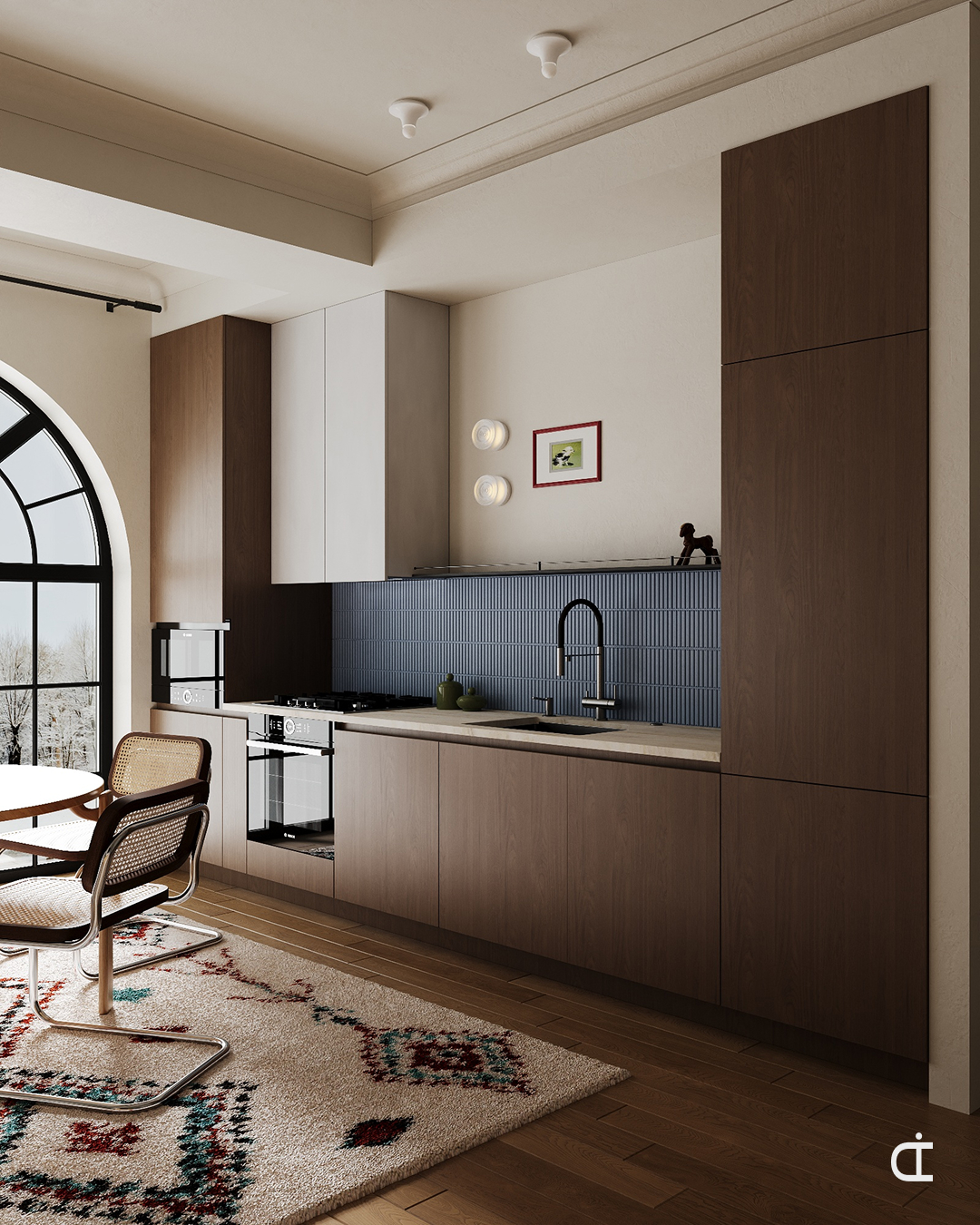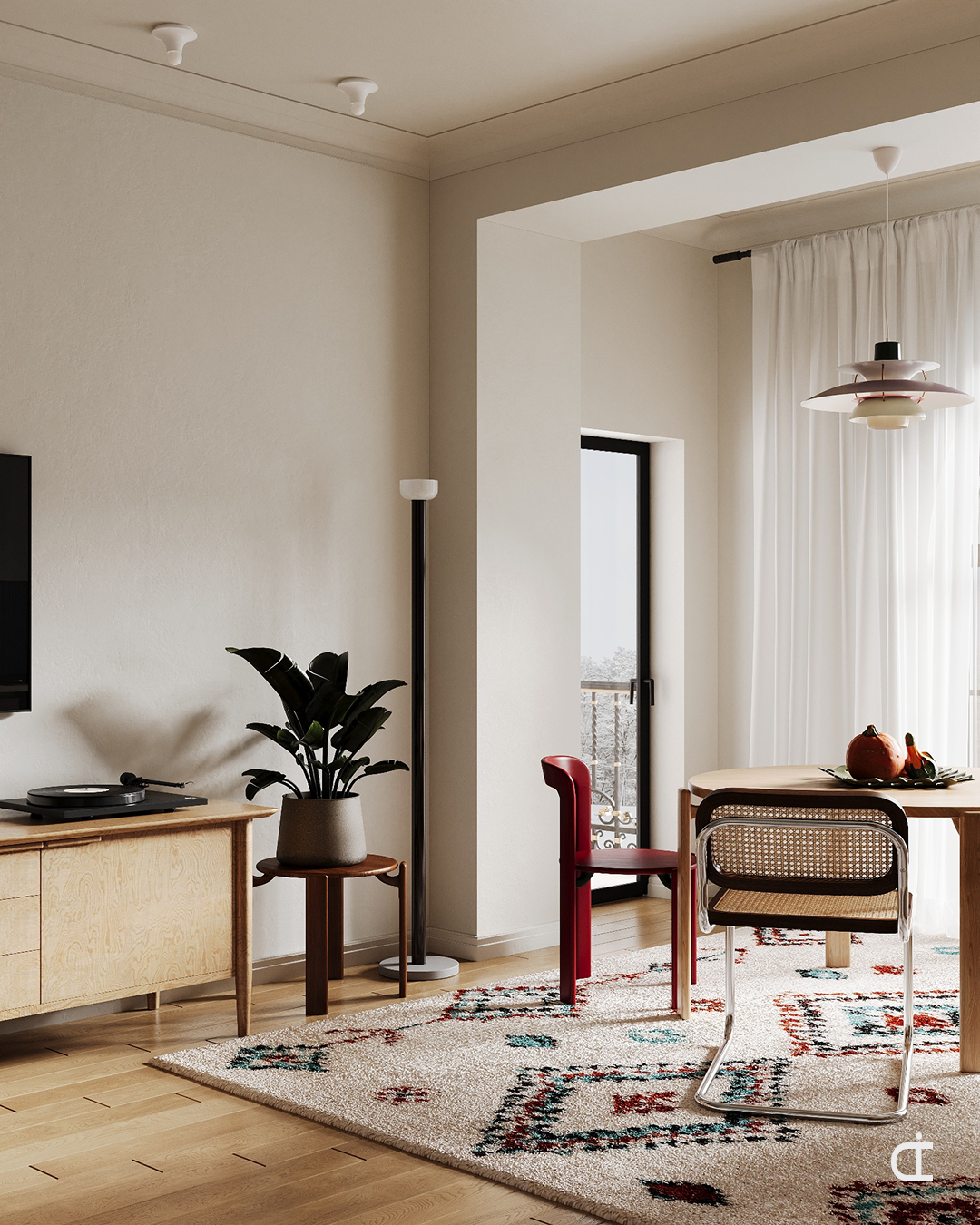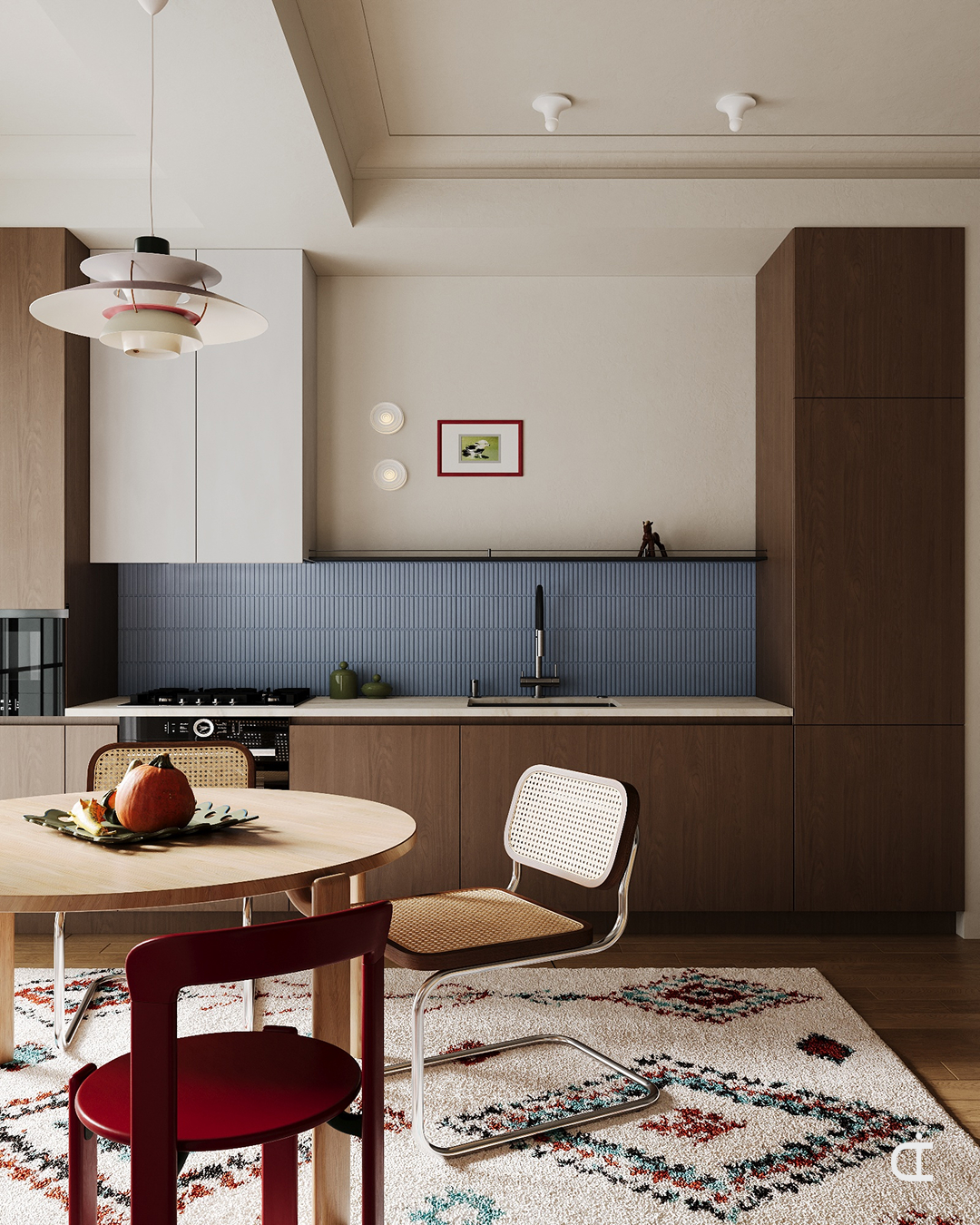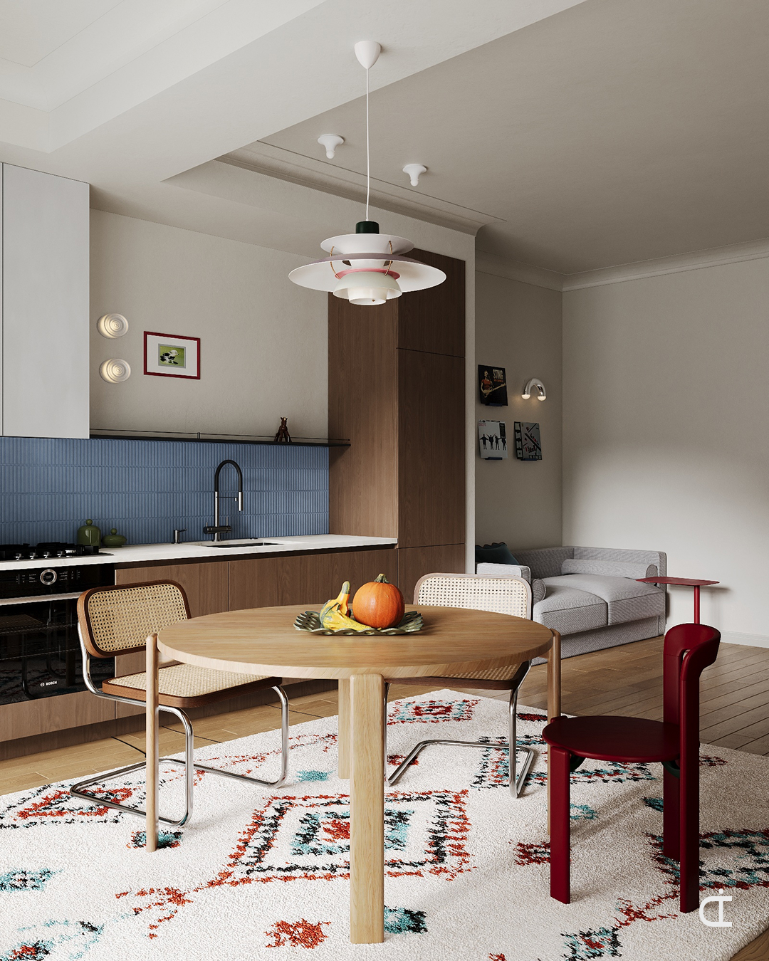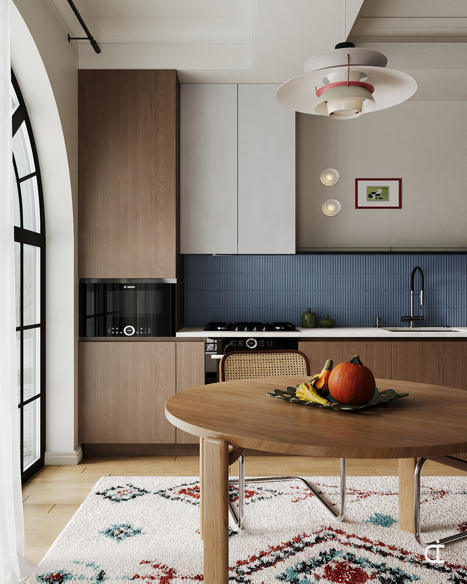 В интерьере акцент сделан на деталях: светильники, стулья разного типа, голубой кухонный фартук. За окном - зима, на столе - тыква как сезонный акцент.