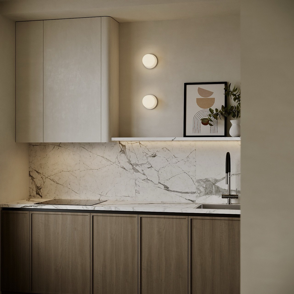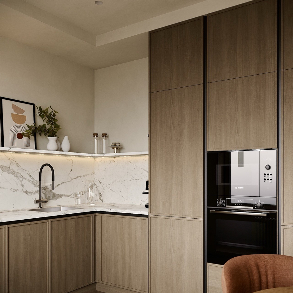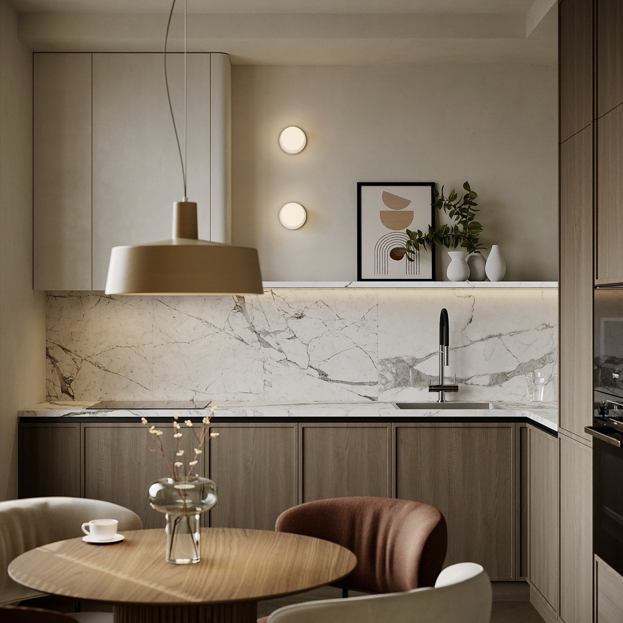 Минимализм в естественных тонах: мрамор, дерево и акценты света создают баланс функциональности и уюта.