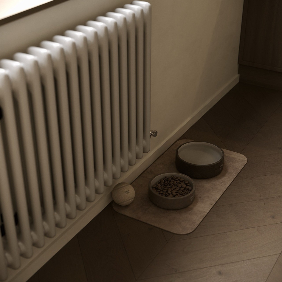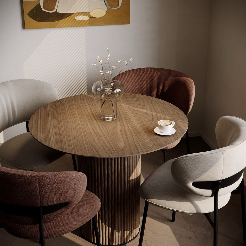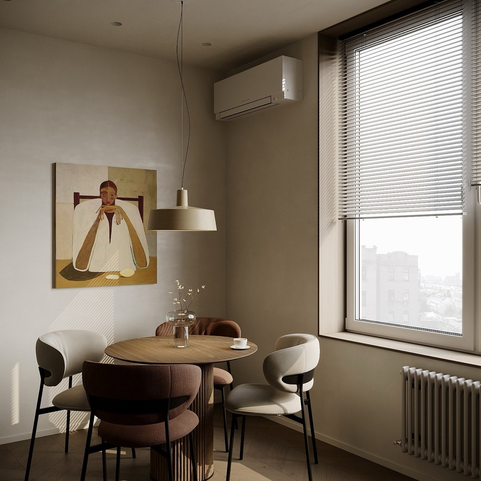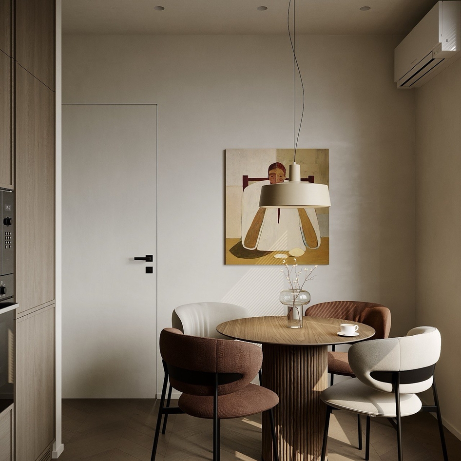 Минимализм в естественных тонах: мрамор, дерево и акценты света создают баланс функциональности и уюта.