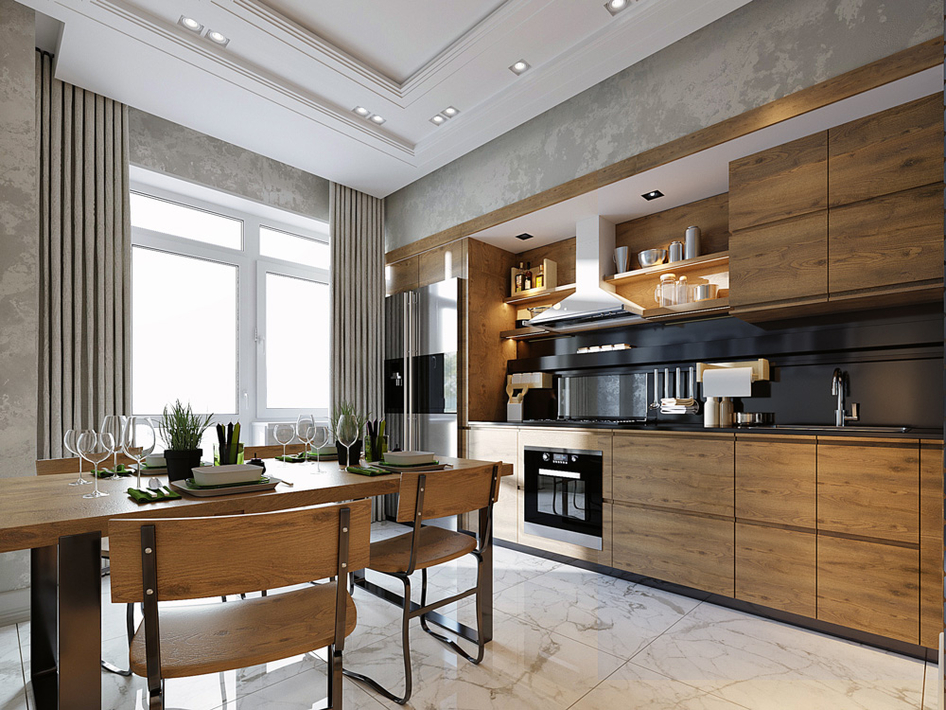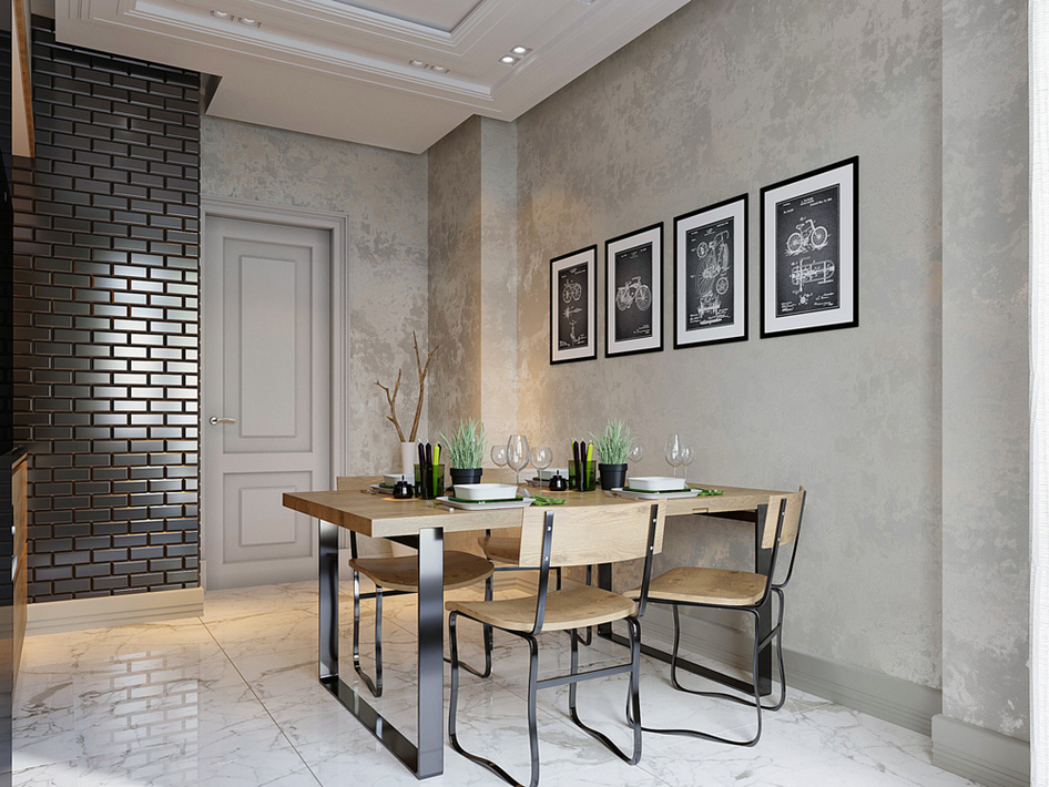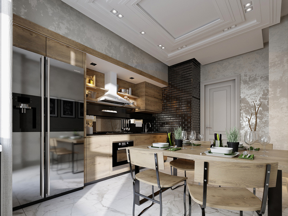 Очень хорошо! Метал холодильника только чересчур как зеркало, у холодильников обычно анизотропия больше. Черные кирпичики - для фотореалистичности думаю не хватает каких-либо мелких царапинок и отпечатков. Текстура на стульях у всех одинаковая, подвигайте UVW гизмо для разнообразия. Мраморный пол - у мрамора (если это реально мрамор) отражение всегда с равномерными искажениями, погуглите. Белая дверь - как-будто без материала, просто белая. А в целом замечательно, удачи Вам!