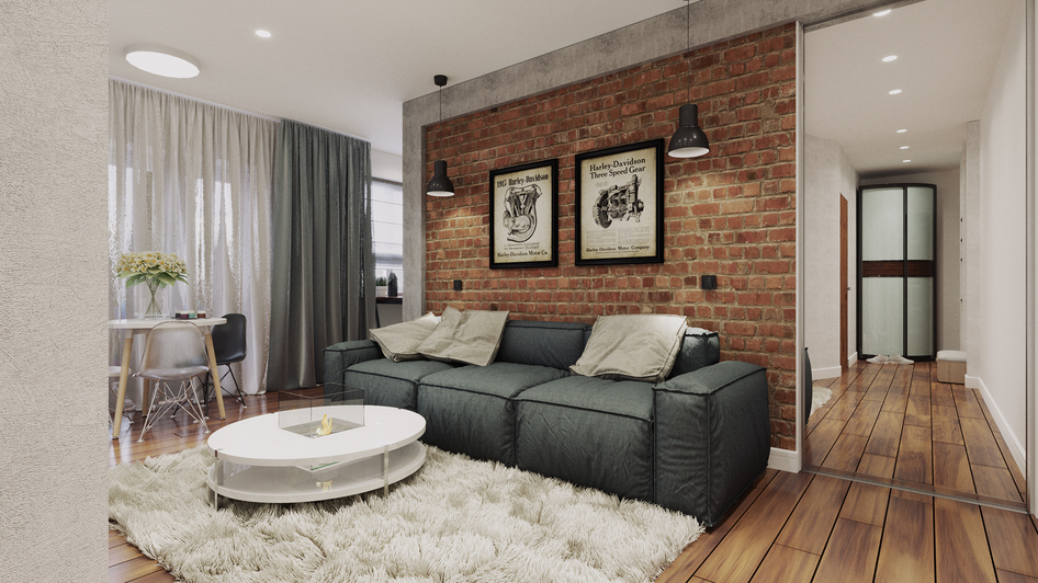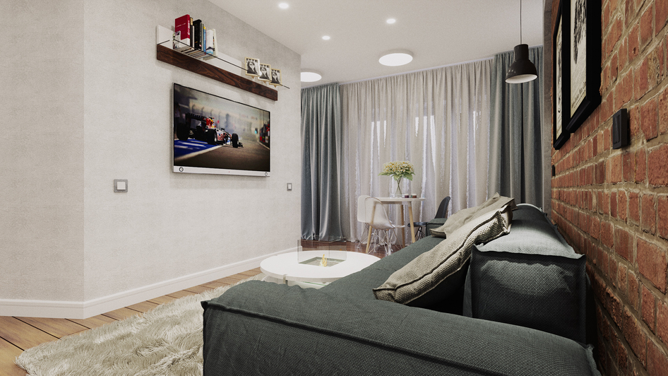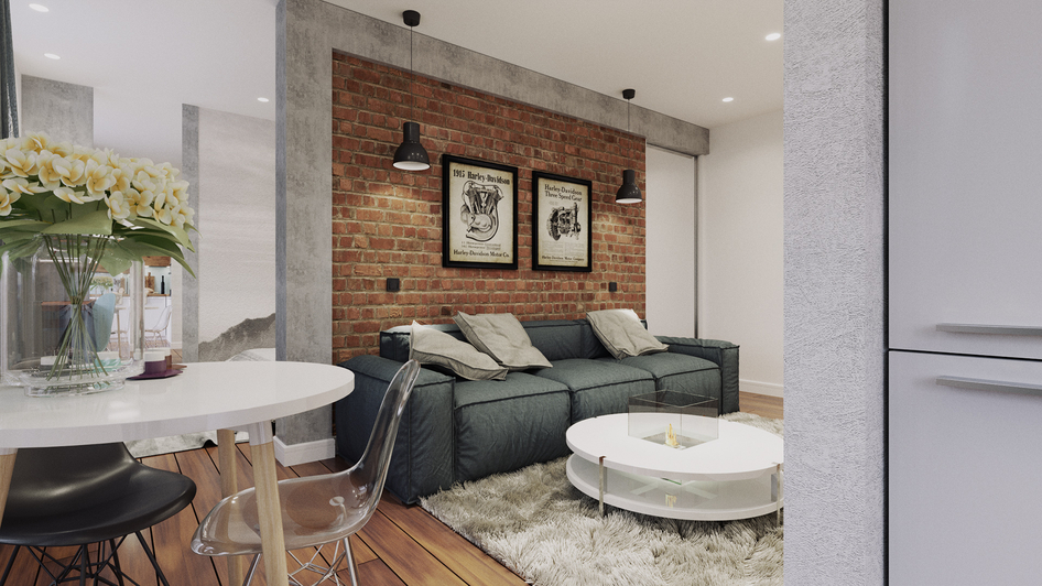 Проект интерьера квартиры 45 м.кв. для молодого человека. Визуализация кухни-гостиной.