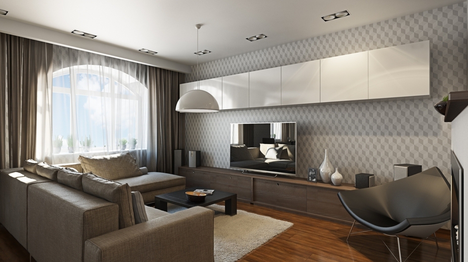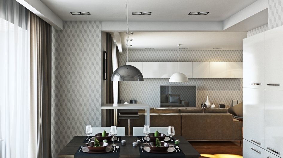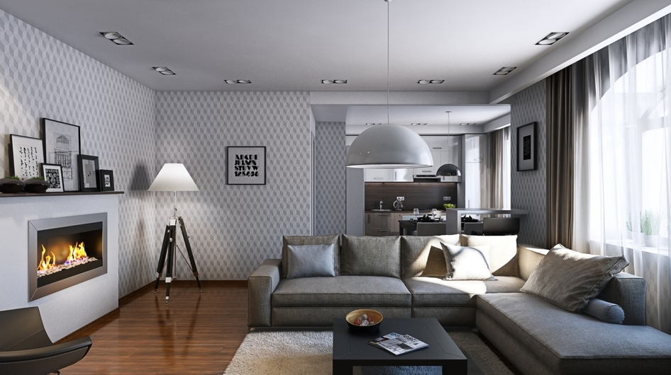 В результате объедения двух комнат получилось пространство общей площадью 36 м2, в которые поместилась зона кухни, барная стойка, зона тв, а также камин.