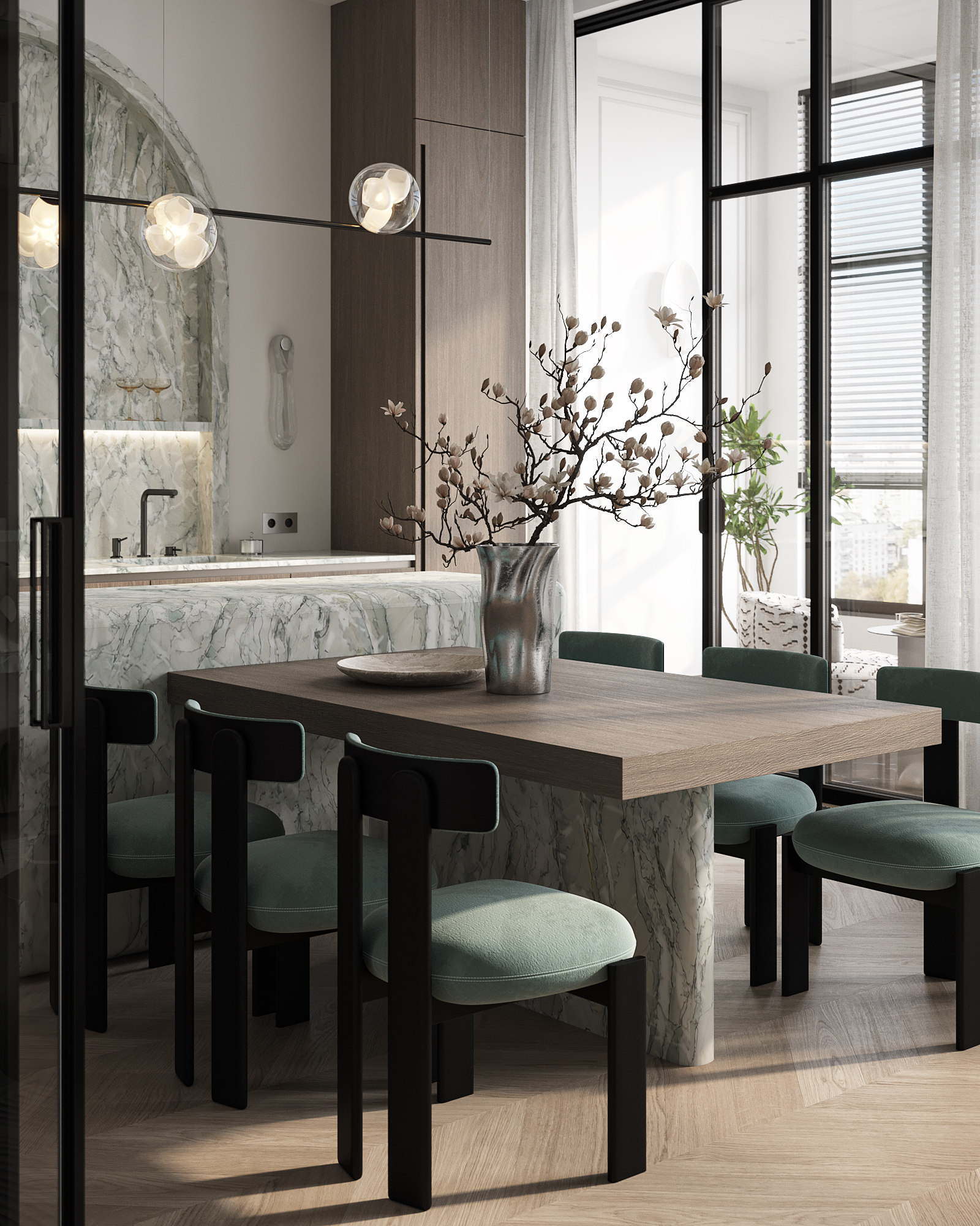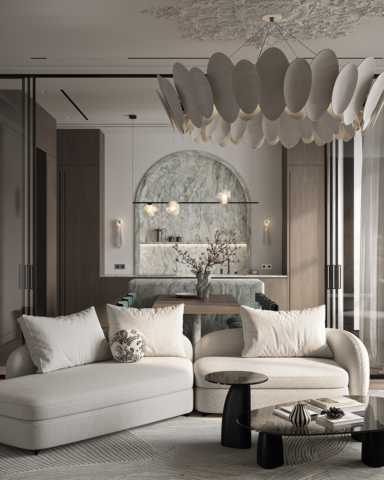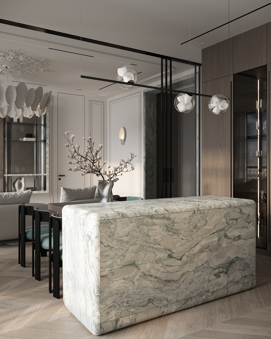 Кухня-гостиная и входная зона в проекте ЖК Река