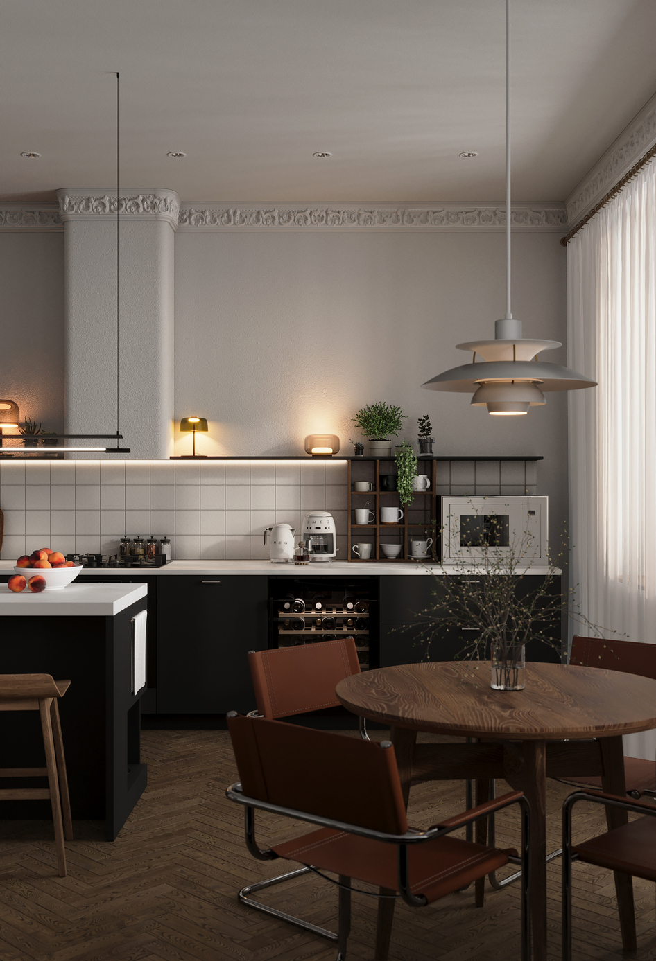 Часть проекта и сердце квартиры - кухня-гостиная, в которой уместились все, порой противоречивые, желания заказчиков.