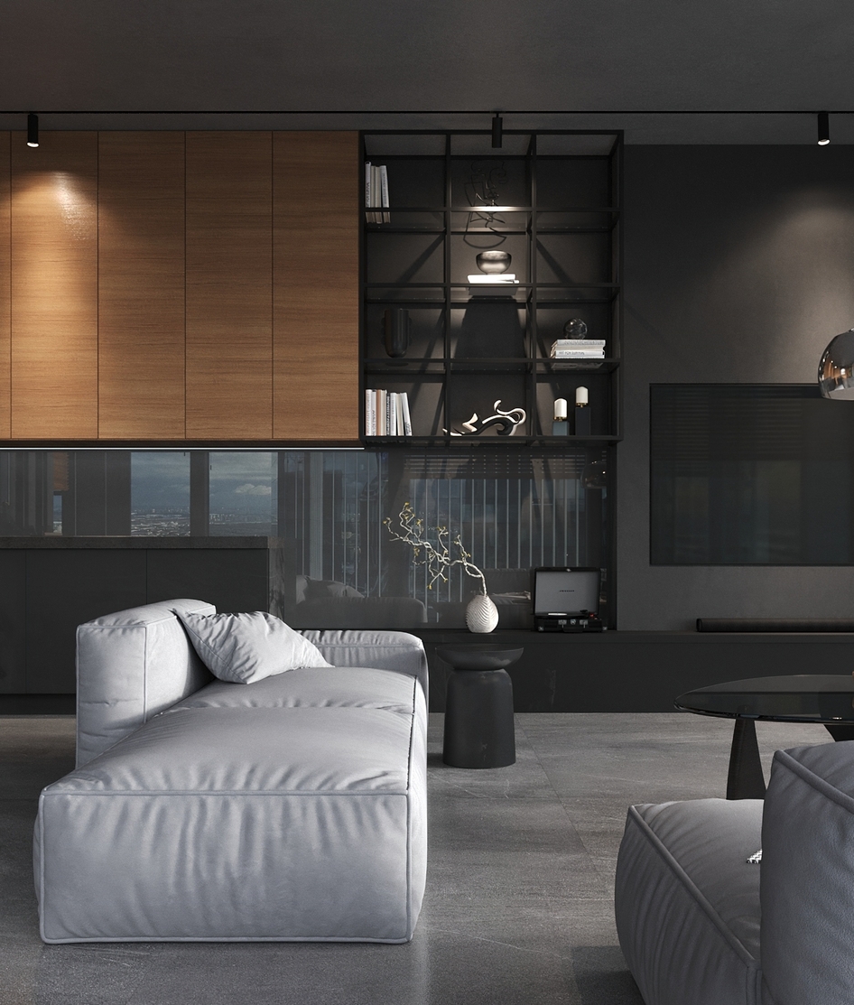 Очень здорово, стильно! Мне нравится, как решен переход из кухонного пространства в гостиную! Вроде бы простыми формами создали сложное пространство!