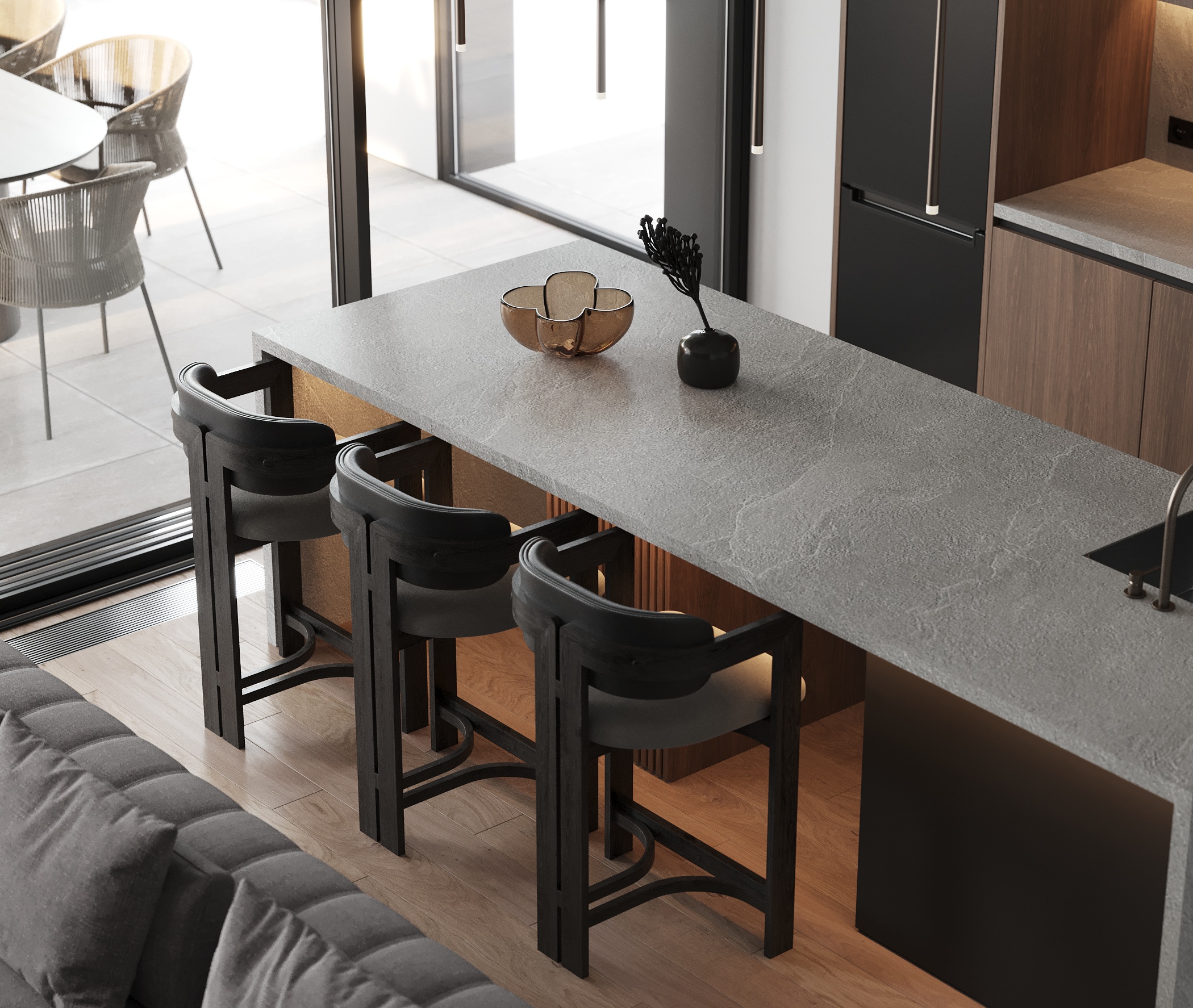 Кухня-гостиная в загородном дом, выполненная по собственному дизайну.