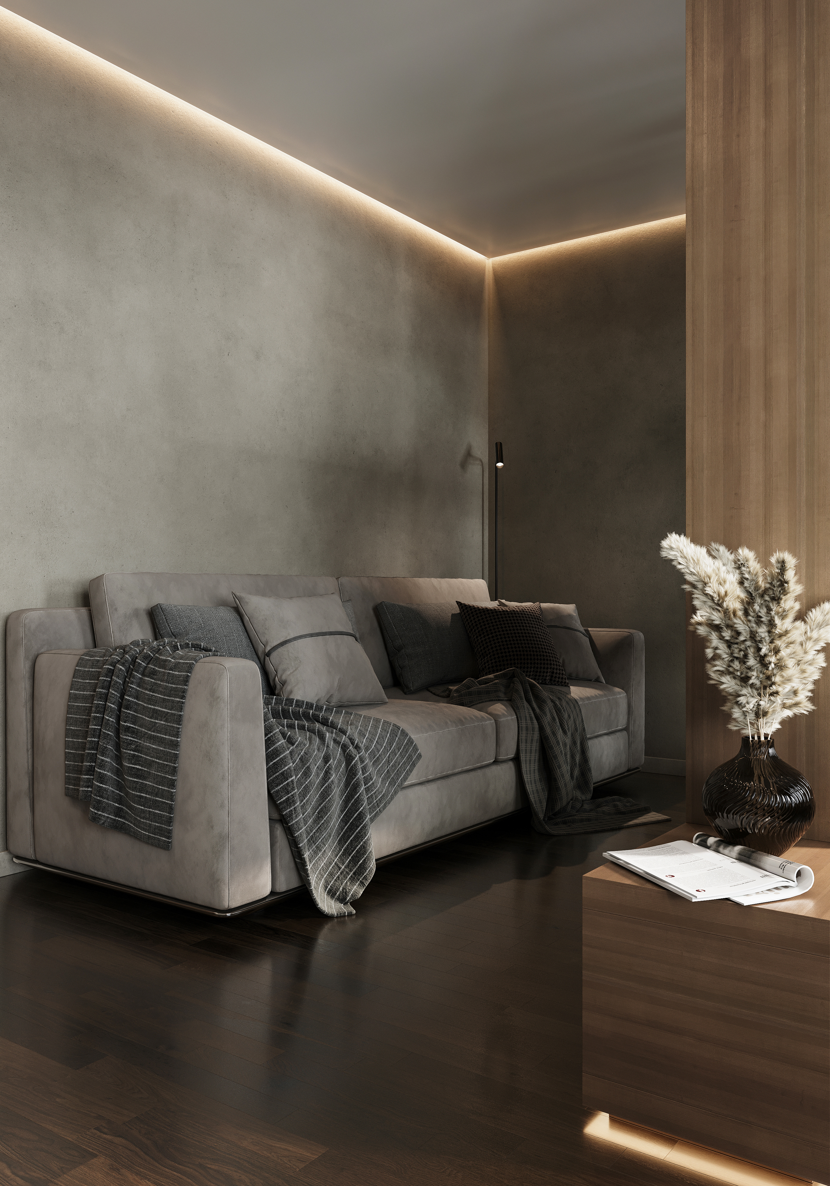 плинтус напольный портит приятную картинку, заморочились с теневым по потолку, плюс скрытые двери, ну по полу тоже надо было теневой, чтобы все в тему уж было