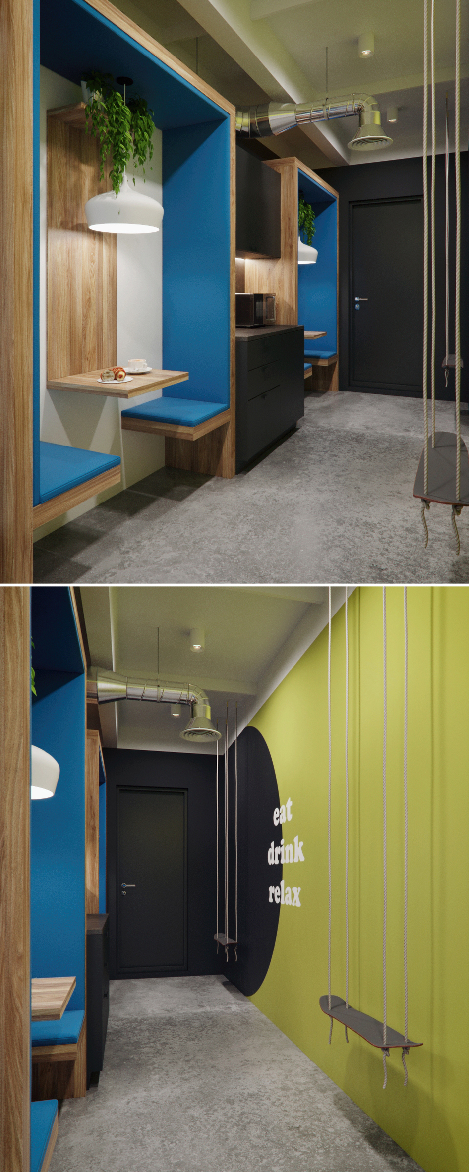 Еще одна часть проекта в Спб. А вообще, ребята теперь получили новое помещение в Art Play и этот проект никогда не реализуется) Ну и супер, потому что их директор продемонстрировал абсолютное хамство и отношение к дизайнером в момент расчета за проект. Пусть другие теперь мучаются;) Прошу прощения за шум на картинках-времени бывает не хватает...Просто хочу поделиться прикольными на мой взгляд решениями в плане креативного офиса)) Подвесные сидения скейты - желание их директора...Сам ума не приложу зачем они)