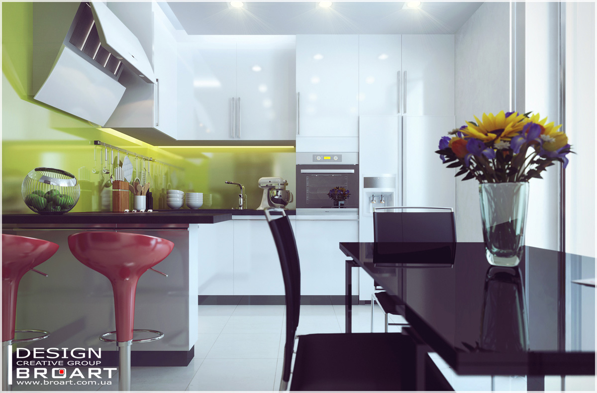 Кухонька хороша, единственное что, хотелось бы немного больше теплоты, букет и черный стол имхо не в тему, уж лучше бы зеленых яблок наложил, сейчас можно провести по центру линию и будет 2 разных интерьера.