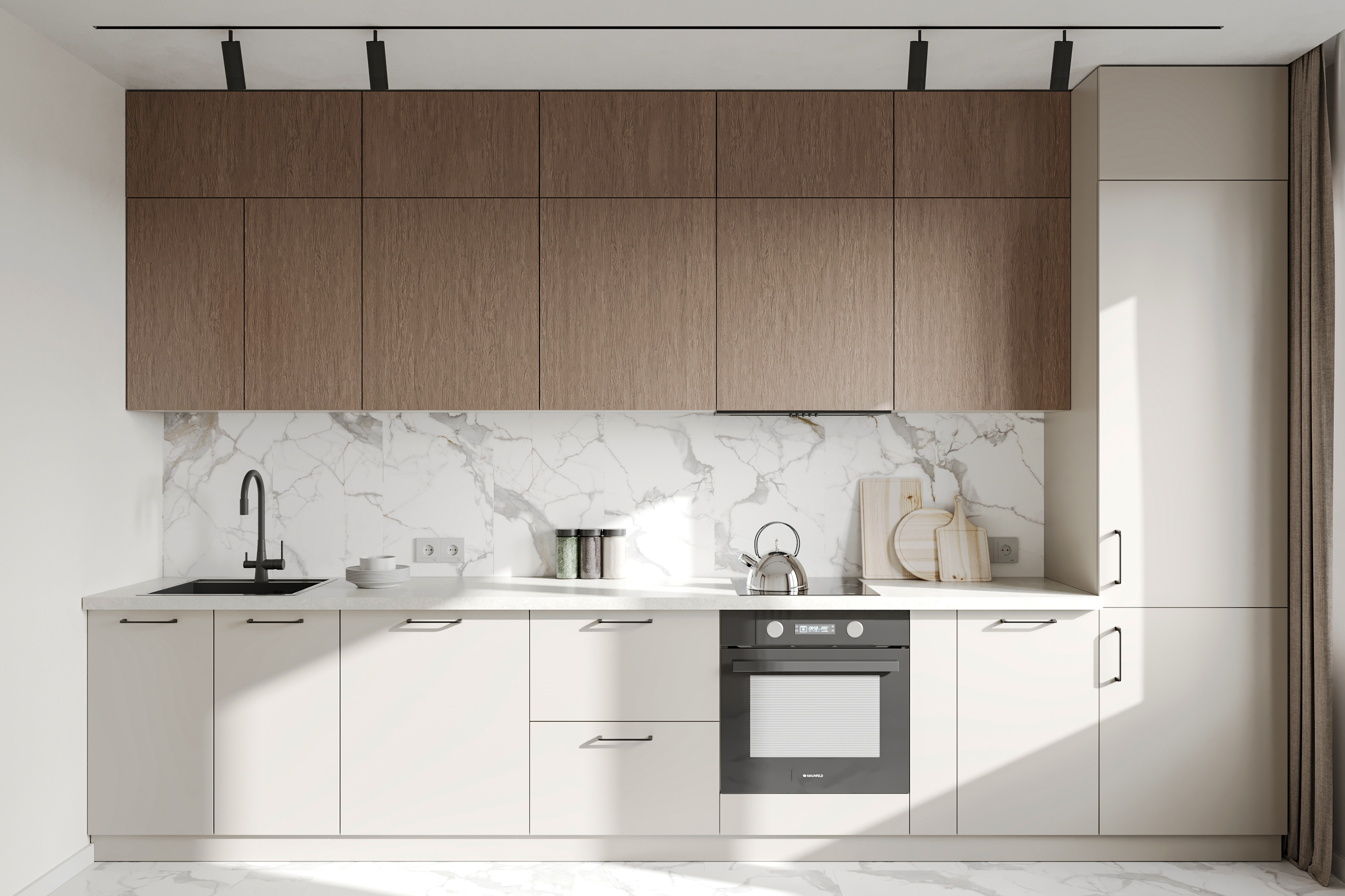 Визуализация кухни столовой. Была выполнена реклама светильников, и фасадов для крупной сети.