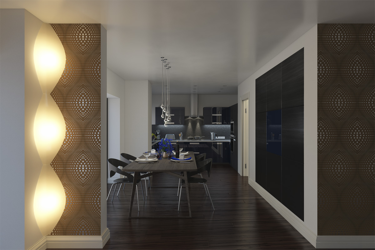 Жаль, что столово-кухонная зона не имеет акцентного освещения. Неплохой ход мог бы получиться, если свет будет идти из дверного проема справа. Тогда и сценарий будет понятней и поддержка угловому светильнику, возможно, обеспечится.