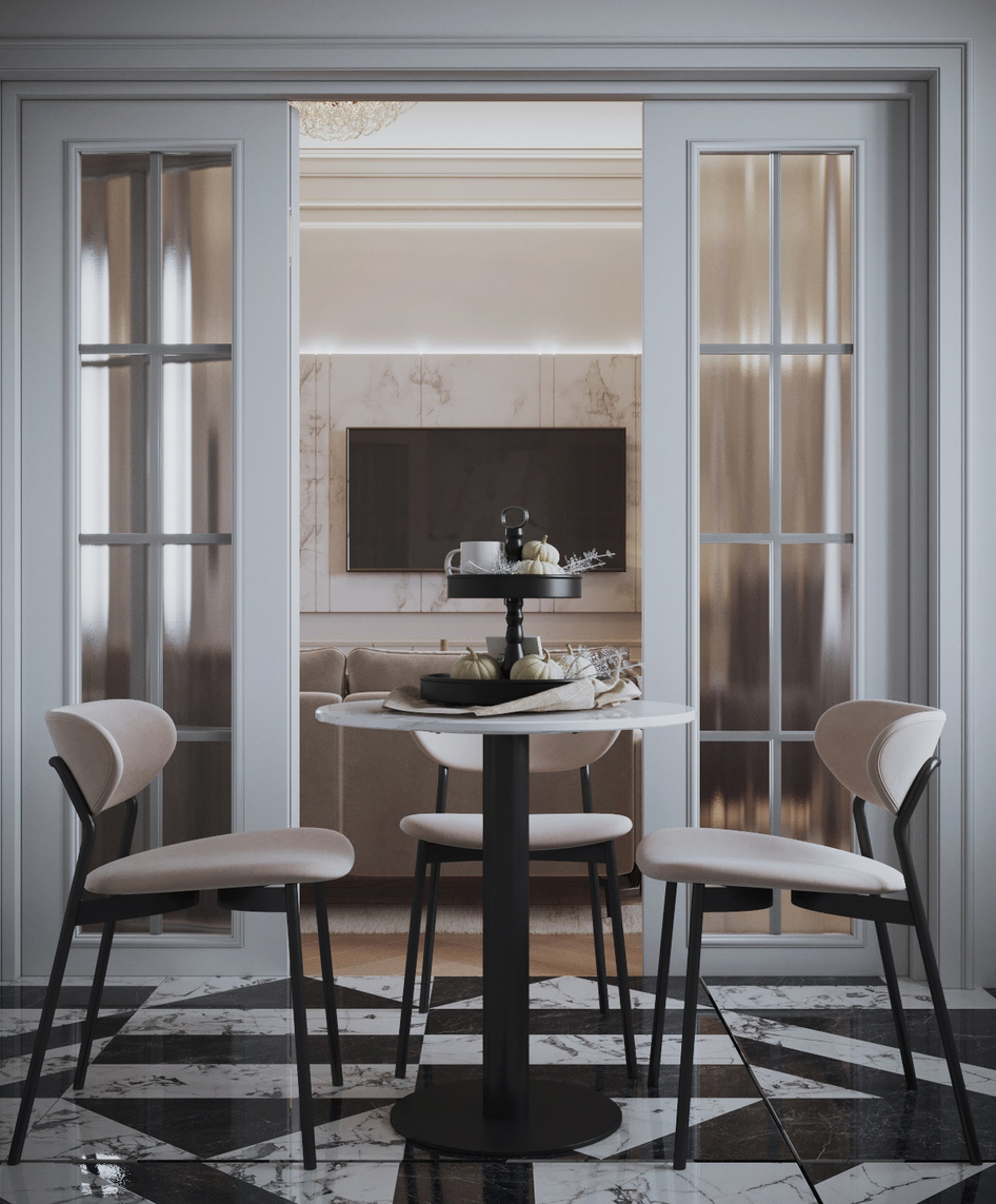 Двери хорошие, с деталями, а вот фасады самой кухни прям простоваты..