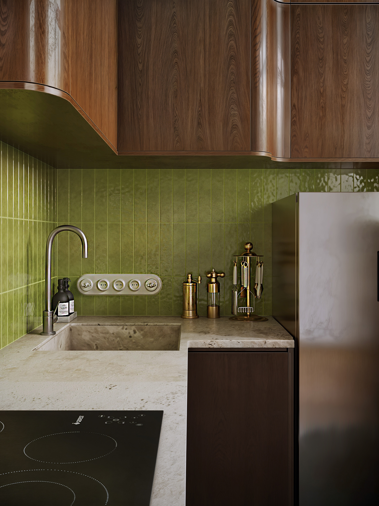 Открытые полки, ретро-бытовая техника, состаренные поверхности и приглушённый свет создают не просто интерьер, а живую сцену из европейского прошлого, адаптированную под современные задачи.