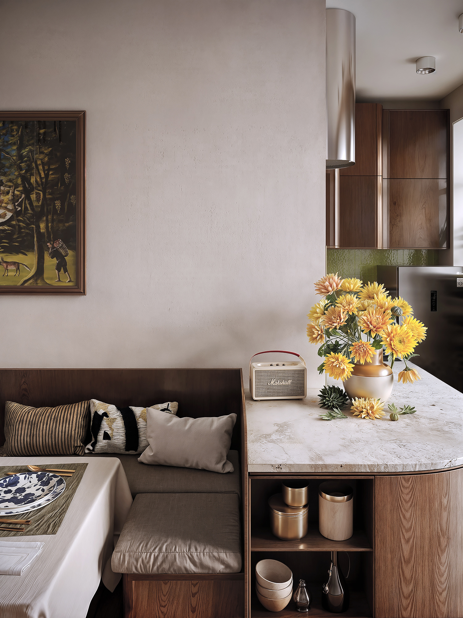 Текстуры натуральных материалов — дерева, керамики, текстиля — передают ощущение времени и жизни.