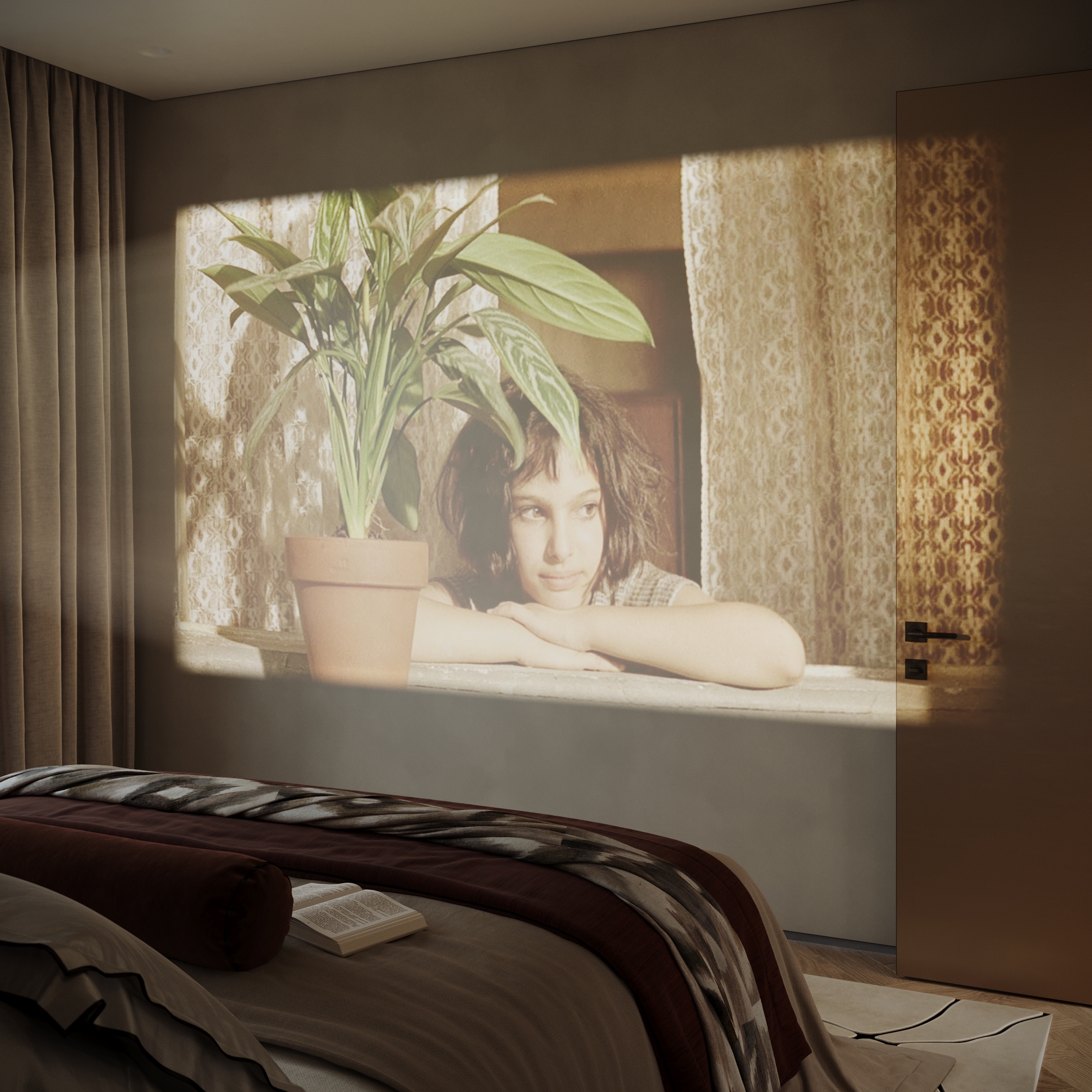 Как мне сказала дизайнер, проектор предполагается над изголовьем кровати. То есть портативный проектор будет, но я не очень поняла, как все же он на изголовье встанет...