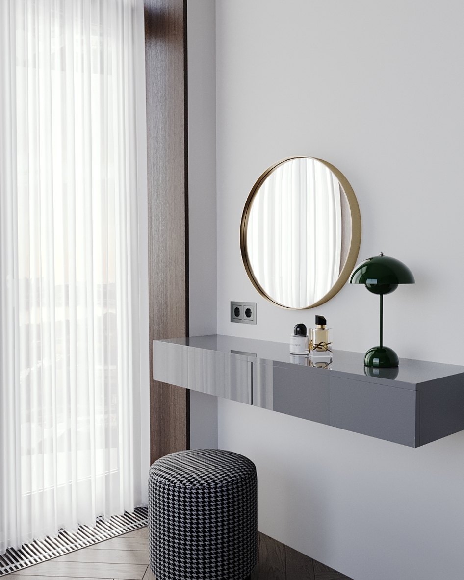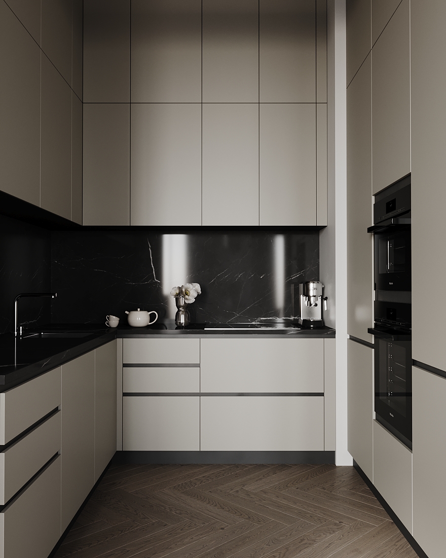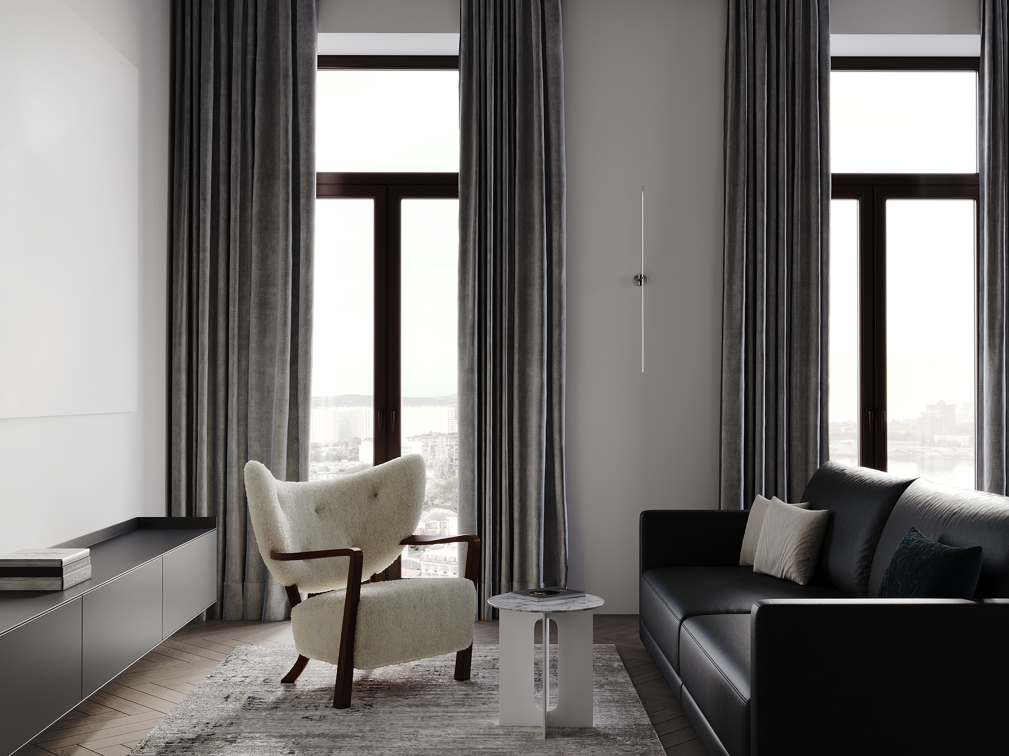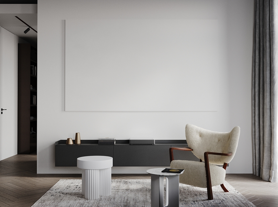 Визуализация (по референсу) квартиры 115 кв. метров для молодой семьи по реализованному проекту дизайнерской студии Артема и Лии Бабаянц (Babayants Architects)