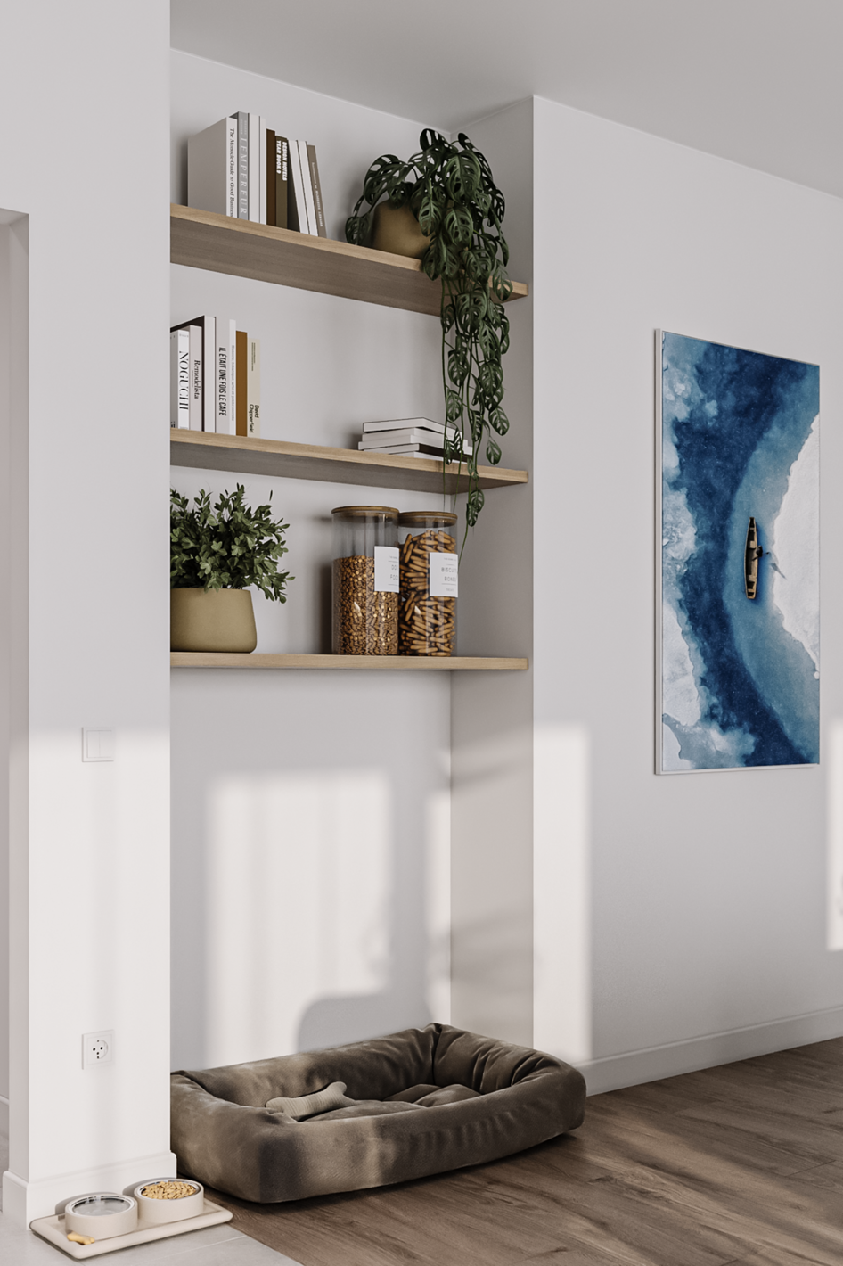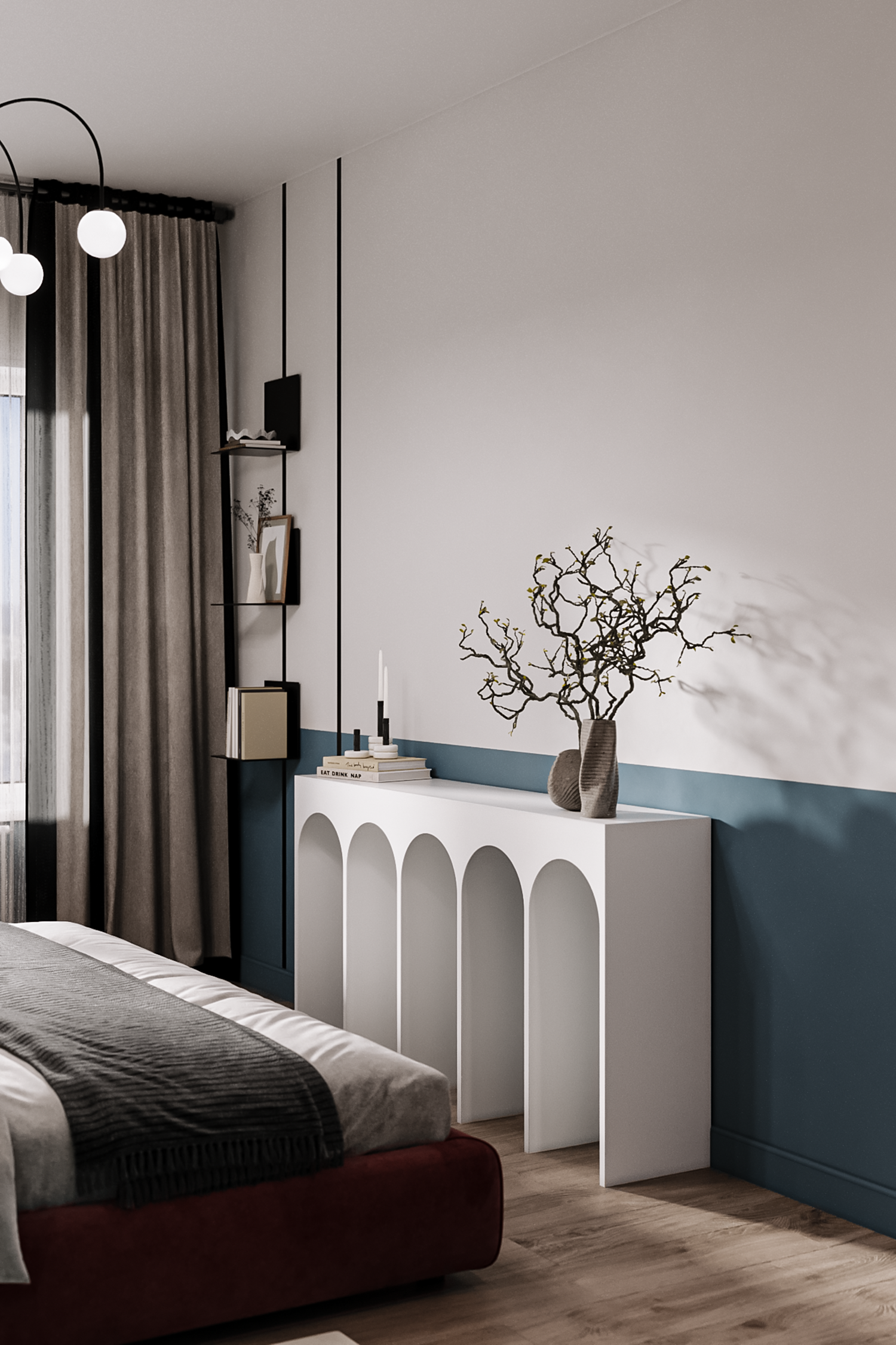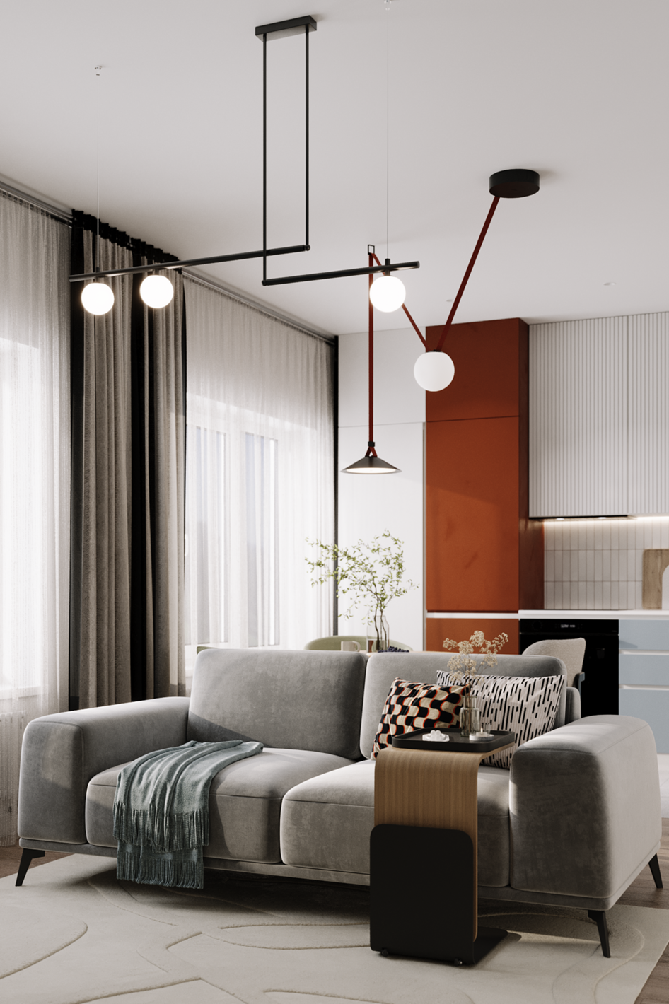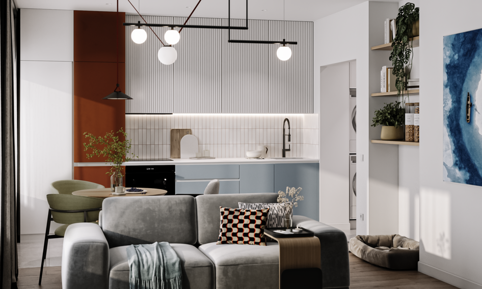 Творческая работа совместно с дизайнером привела к появлению квартиры с яркими цветовыми акцентами, встроенными в стандартную белую отделку