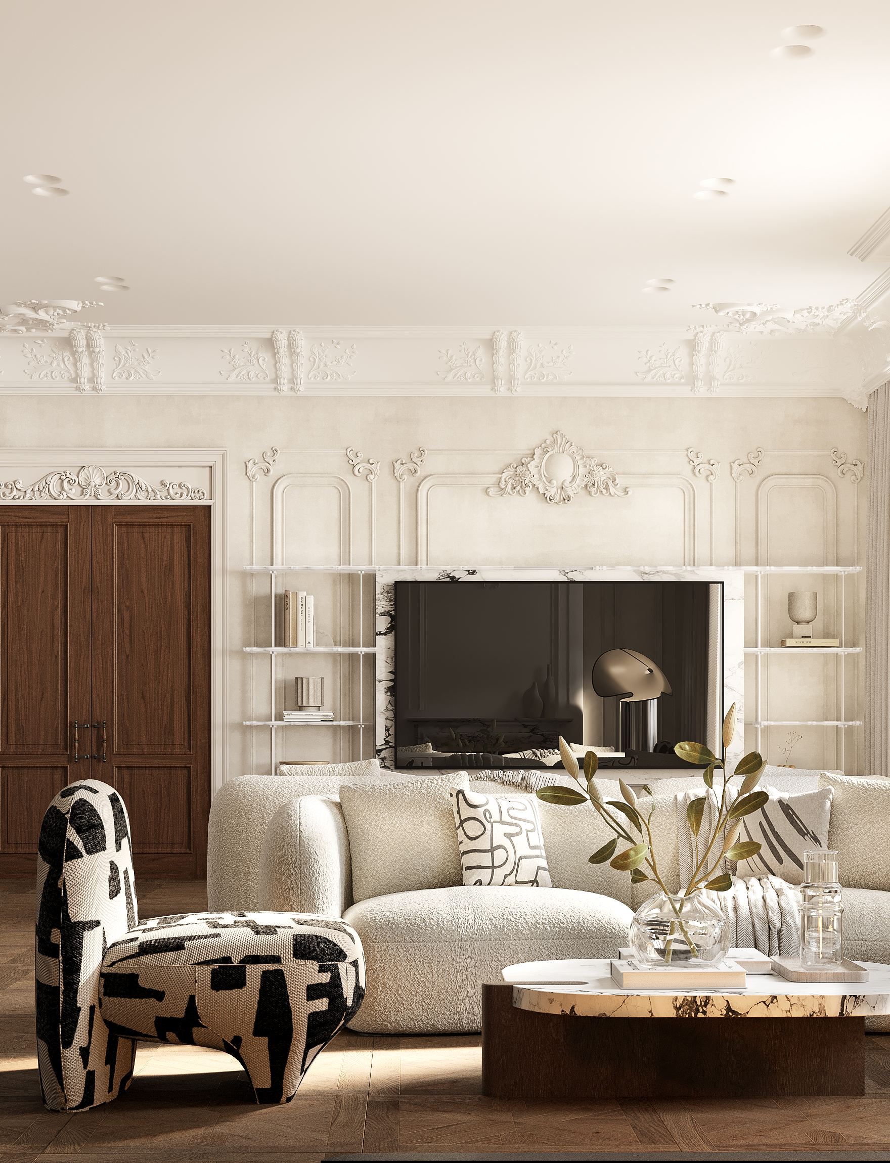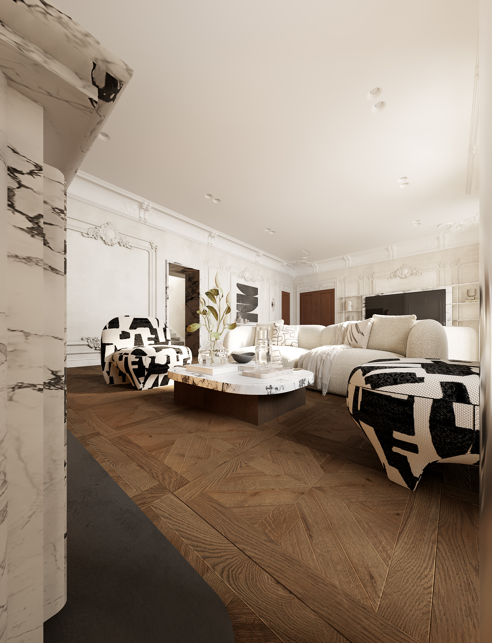 Отличная работа и люди с эффектом размытия меня, например, пока ещё не смущают и придают живость кадру. От чего бы я попытался избавиться, при условии, что есть время, то больше проявил объём карниза, лепнины и потолка. Сам сталкиваюсь с тем, что плоскости этих элементов сливаются и объём пропадает. Варианты как я решаю: