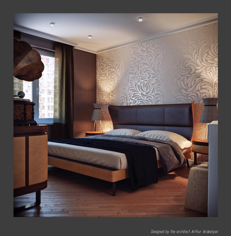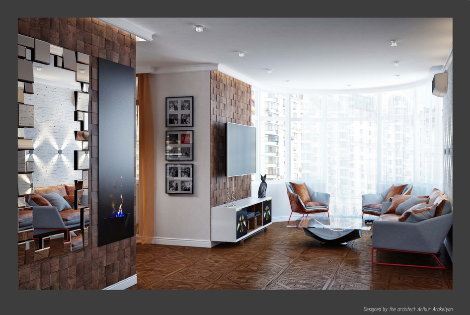 Дизайн не понравился вообще. Ну во первых он вряд ли реален. Заказчики, выбирающие в спальню обои Марбург, не позволят себе деревянную мозаику, речь идет о PORCELANOSA, не иначе? Она самая дорогая из всех существующих. Я пробовала заказать краснодеревщикам подобную - тоже золотая выходит. И по факту - там где мозаика зачем кирпич? И наоборот. При таком активном паркете. Далее, эта самая мозаика в реале немного мельче и толще.По краю этого не видно - а на самом деле этот край был бы очень неаккуратным. Телевизор слишком высоко! Посмотрите на угол просмотра, это недопустимо.