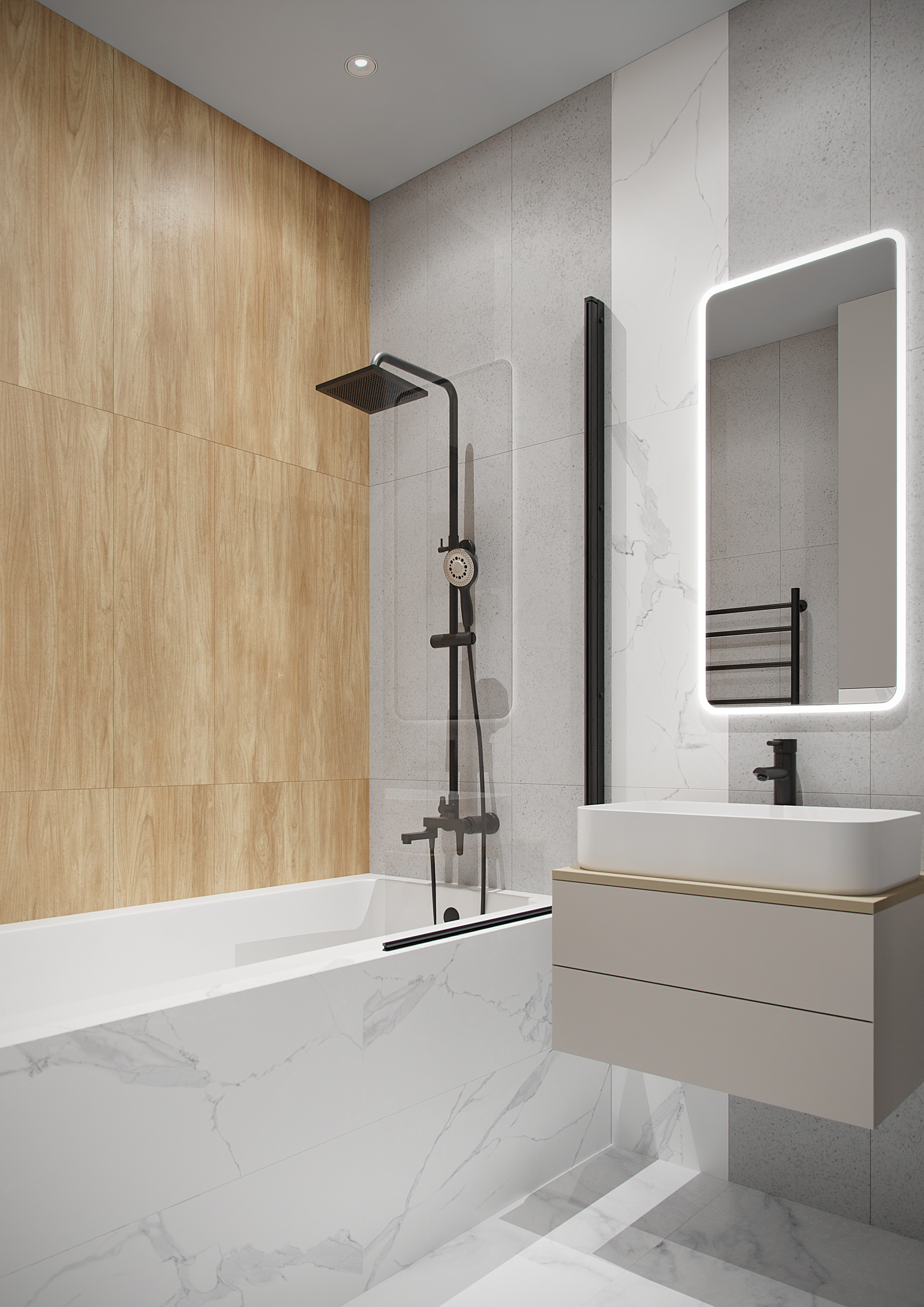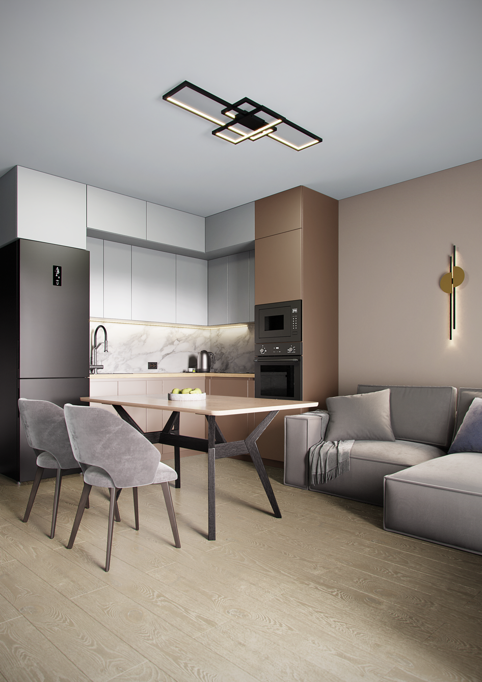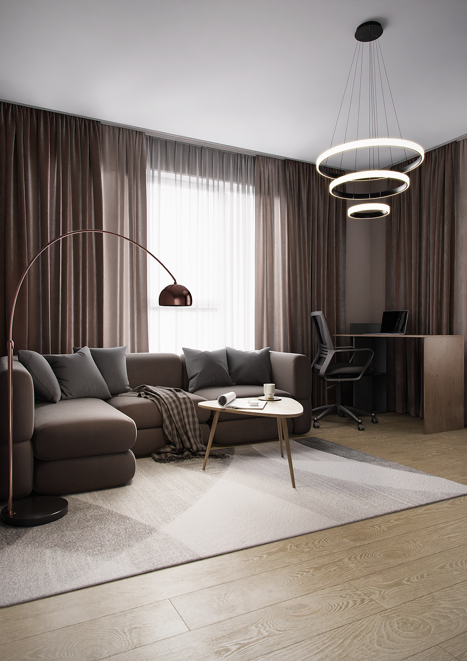 Визуализация кухни-гостиной, спальной, рабочего кабинета и ванной комнаты.