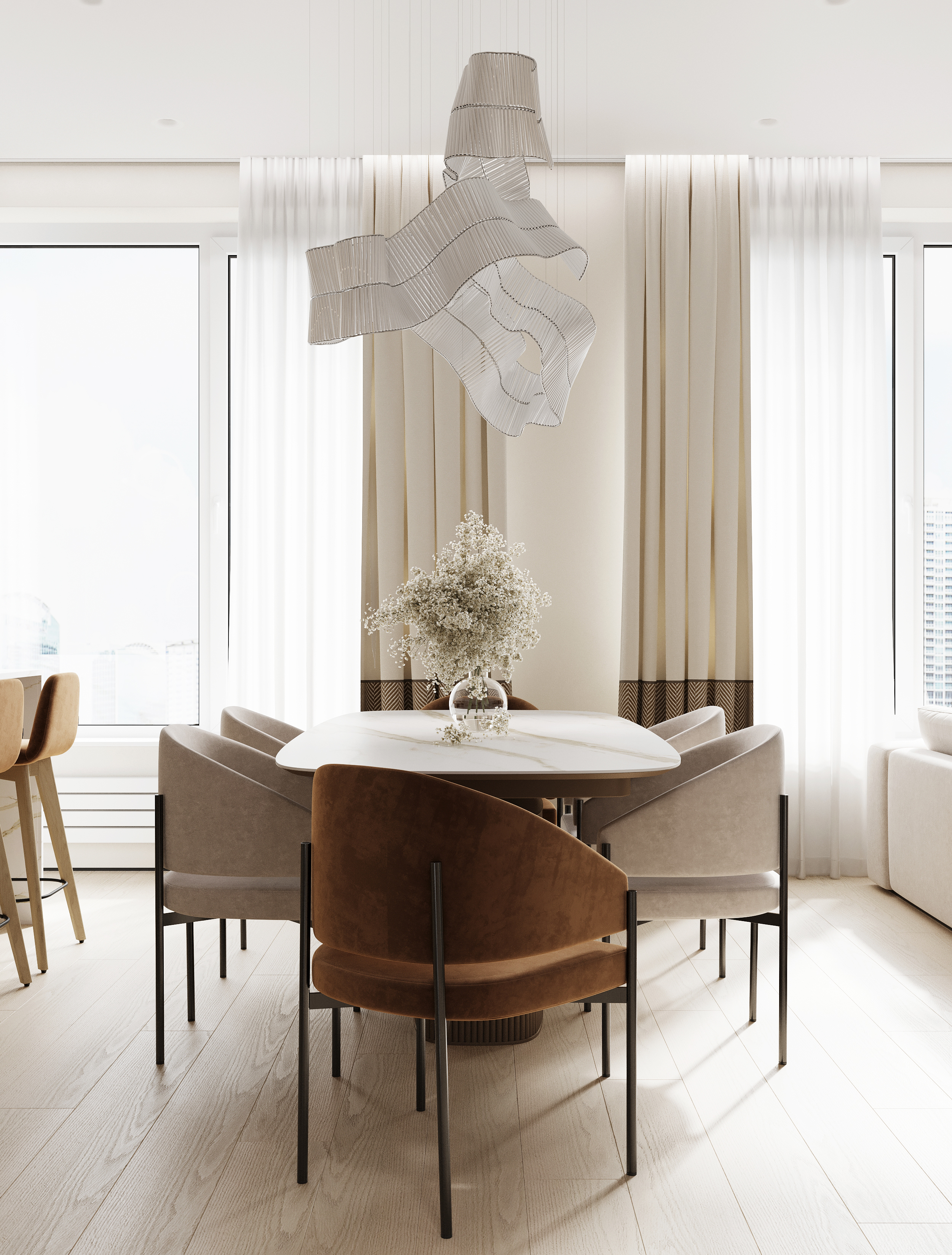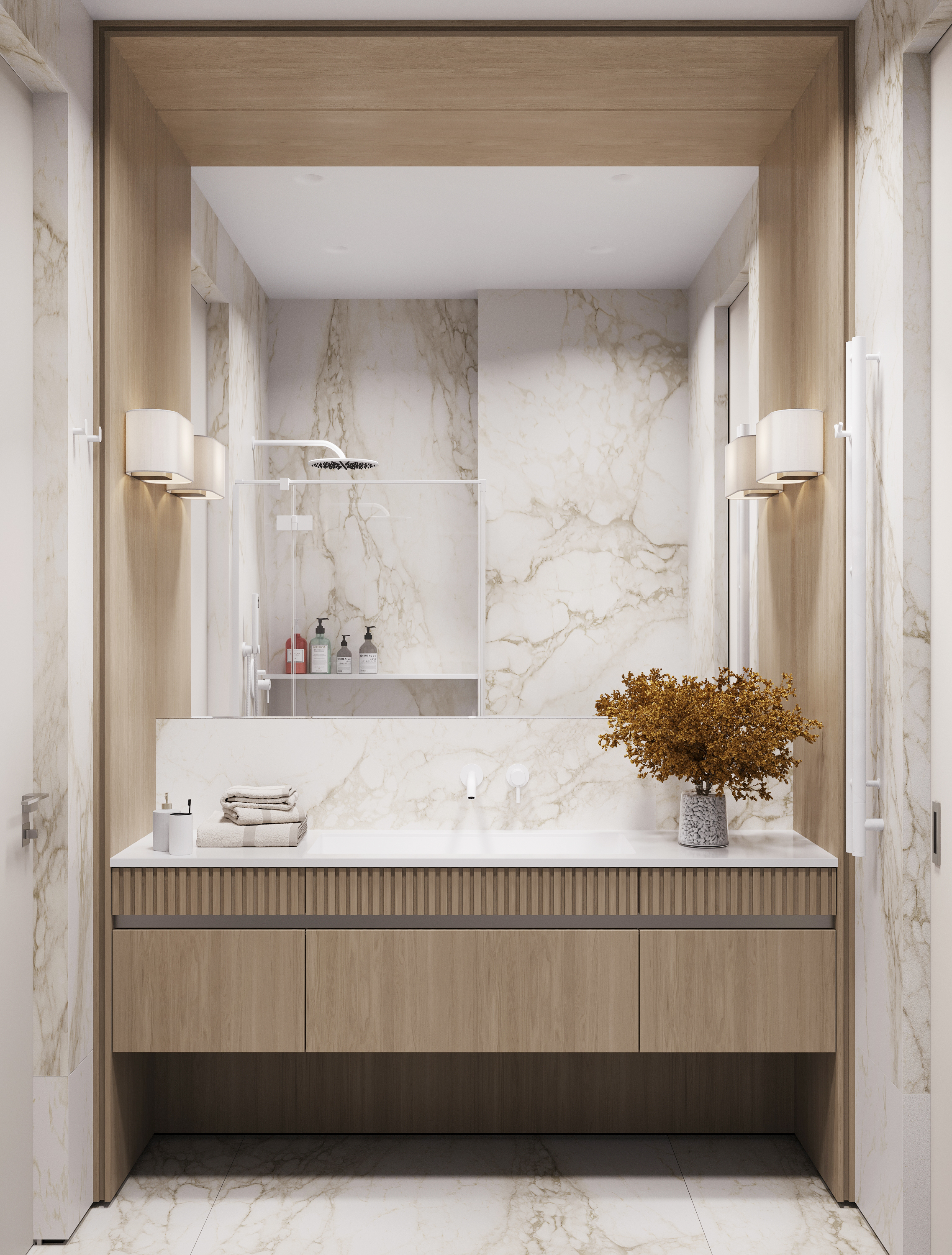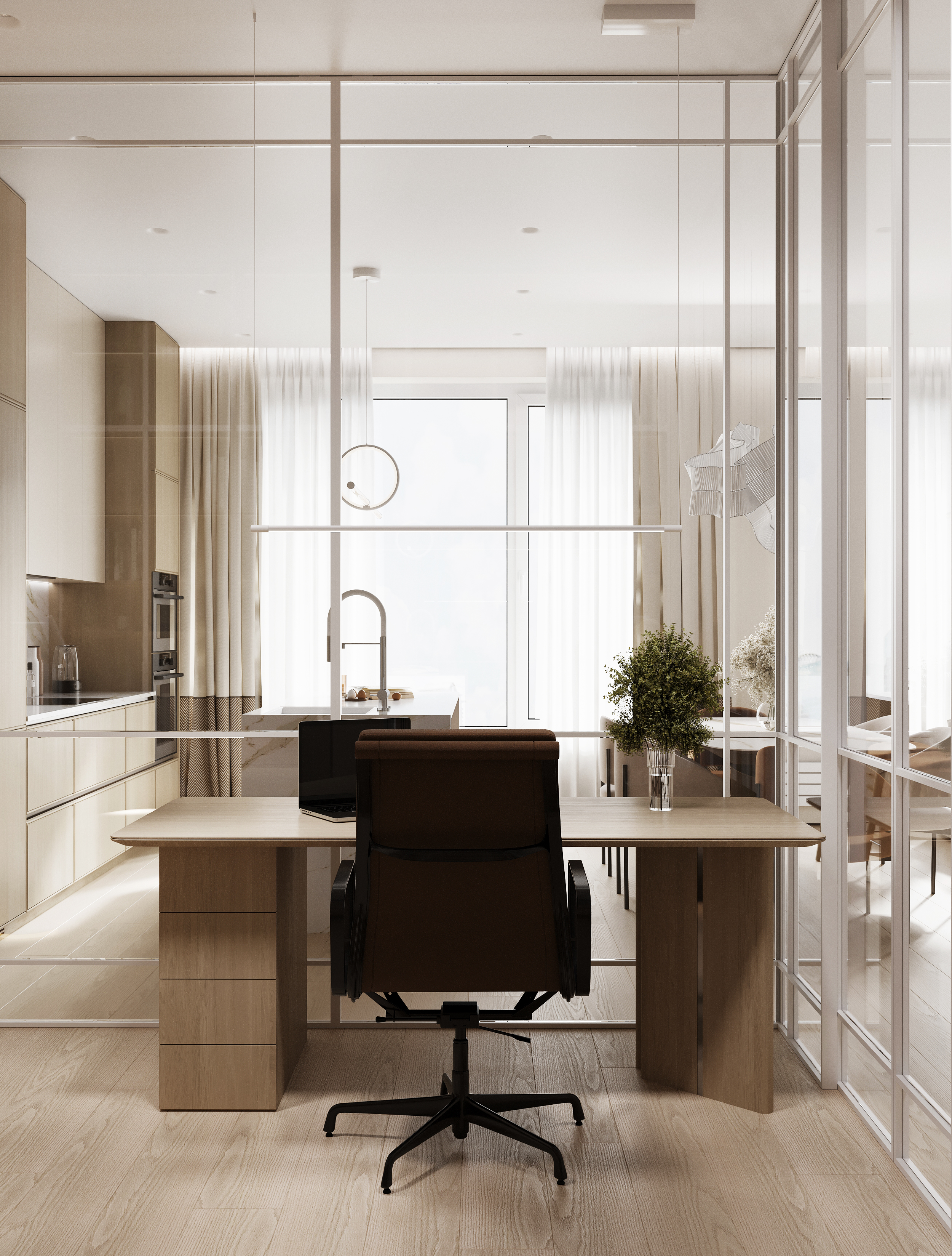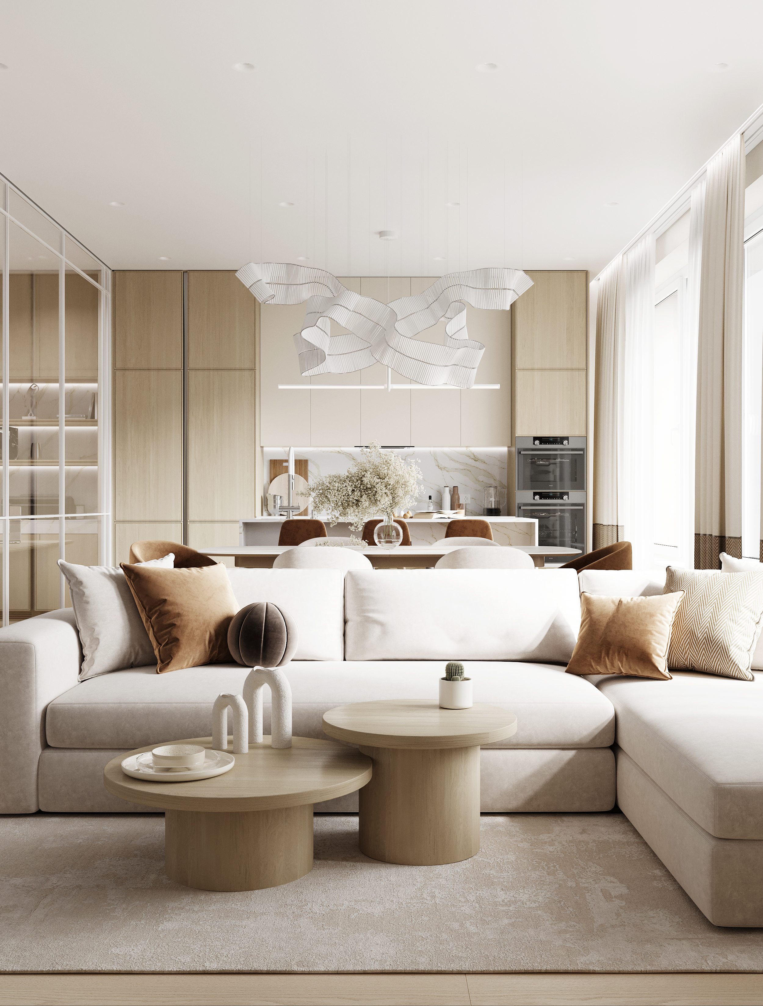 Бежевая квартира с большим количеством шпонированной мебели и необычной тв-зоной.