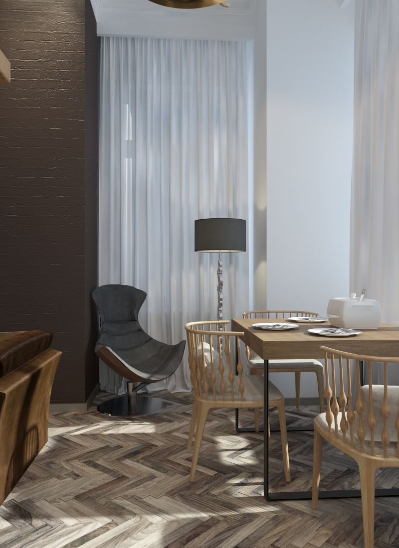 материалы получились совершенно мертвые, особенно дерево, из-за этого и вся картинка "не играет". И кресло Lobster не совсем удалось геометрически. У вискорбела есть урок по нему, там детально показано, как его делать.