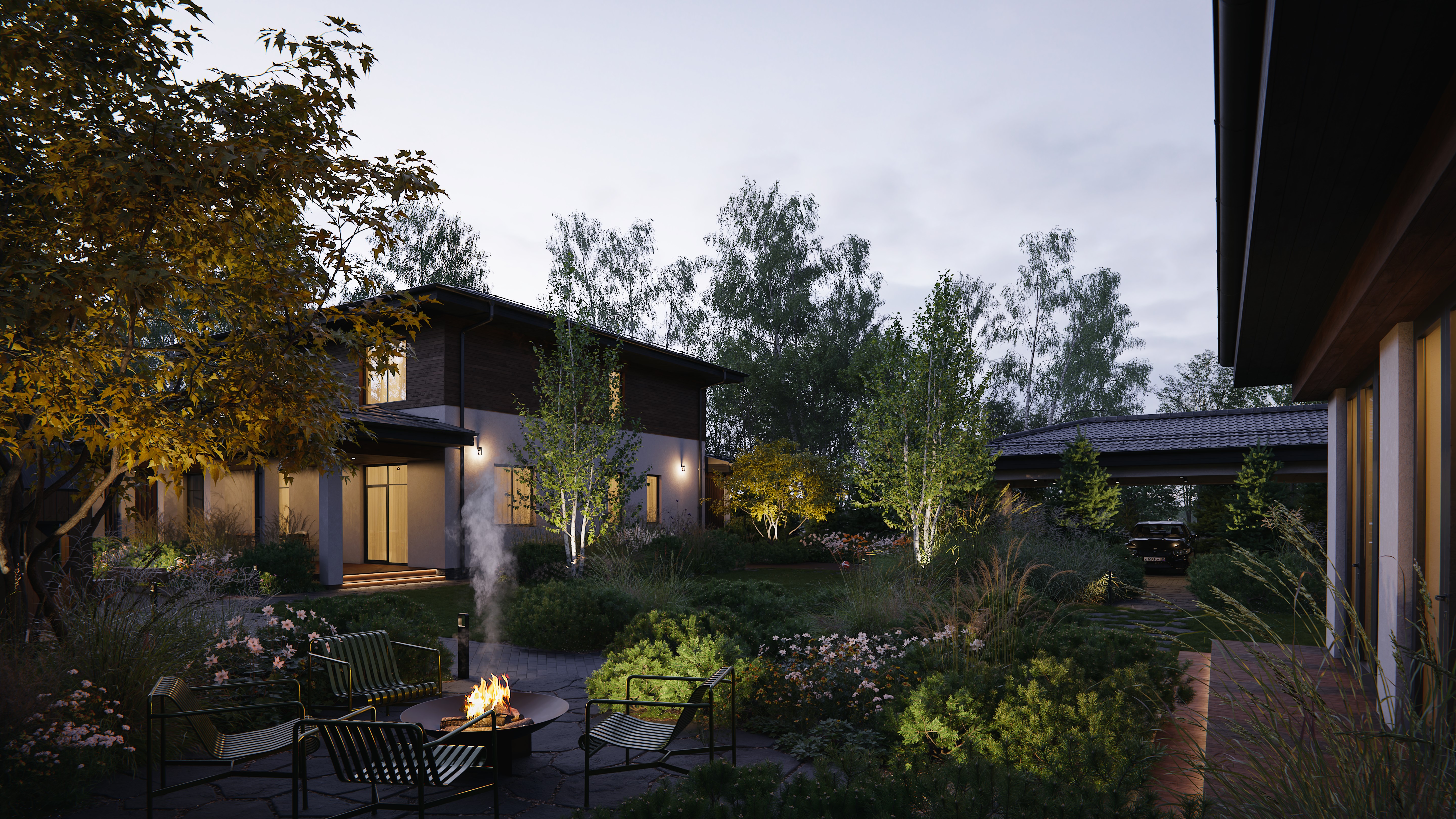 Основной задачей было показать обустройство различных зон на участке, ландшафтные отделочные материалы и посадки, опираясь на планы, фотографии и референсы. Также необходимо было показать подсветку участка в вечернее время суток.