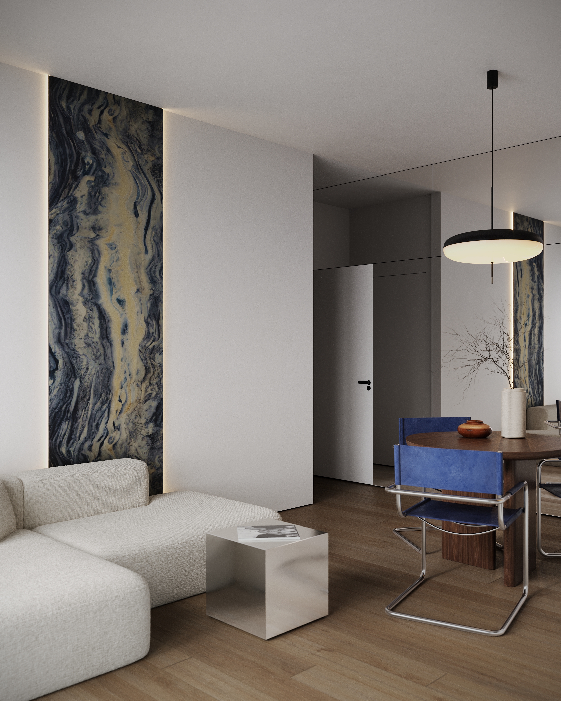 Проект минималистичной кухни - гостиной в 1-комнатной квартире 42 кв.м. ЖК Метрополия, корпус Флоренция, г.Москва