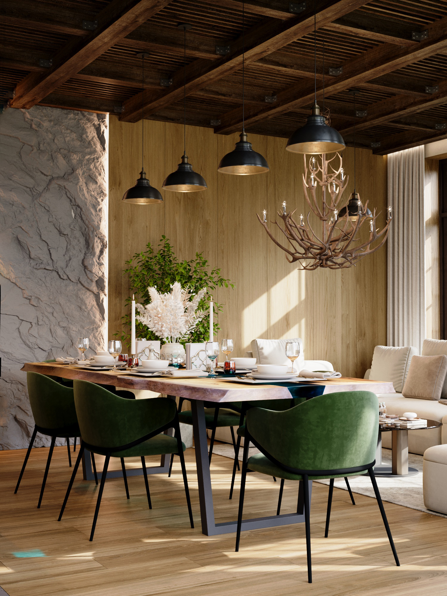 Визуализация дизайн-проекта летней кухни. Для дополнительного комфорта отдыхающих зоны отделены друг от друга стеклянной перегородкой с дверью