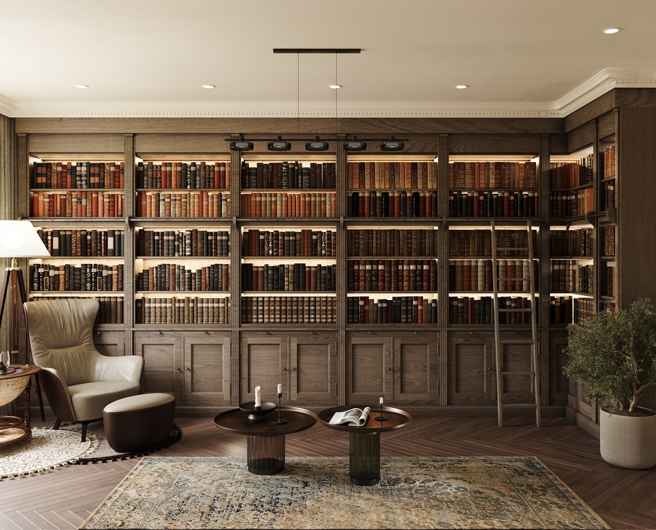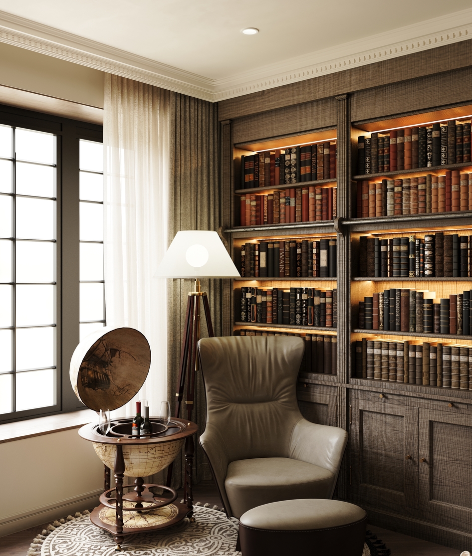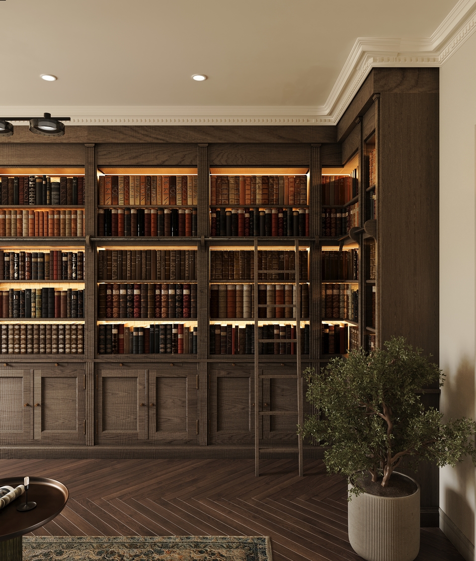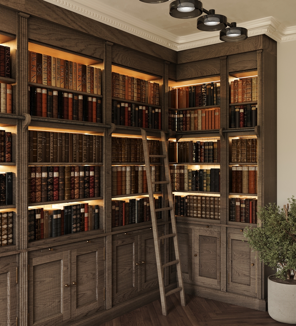 Явная проблема с материалом книжного шкафа и направлением текстуры на лестнице.