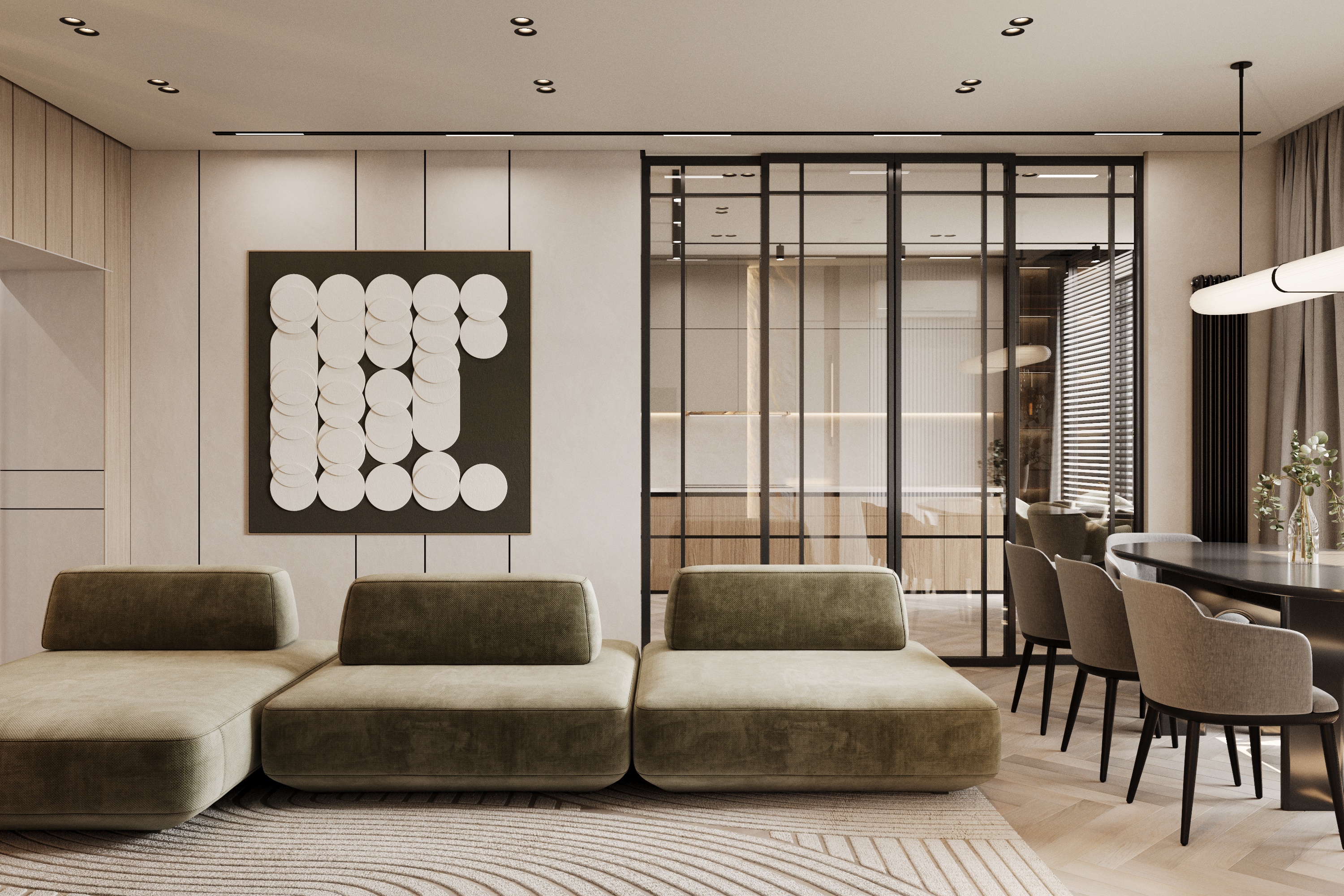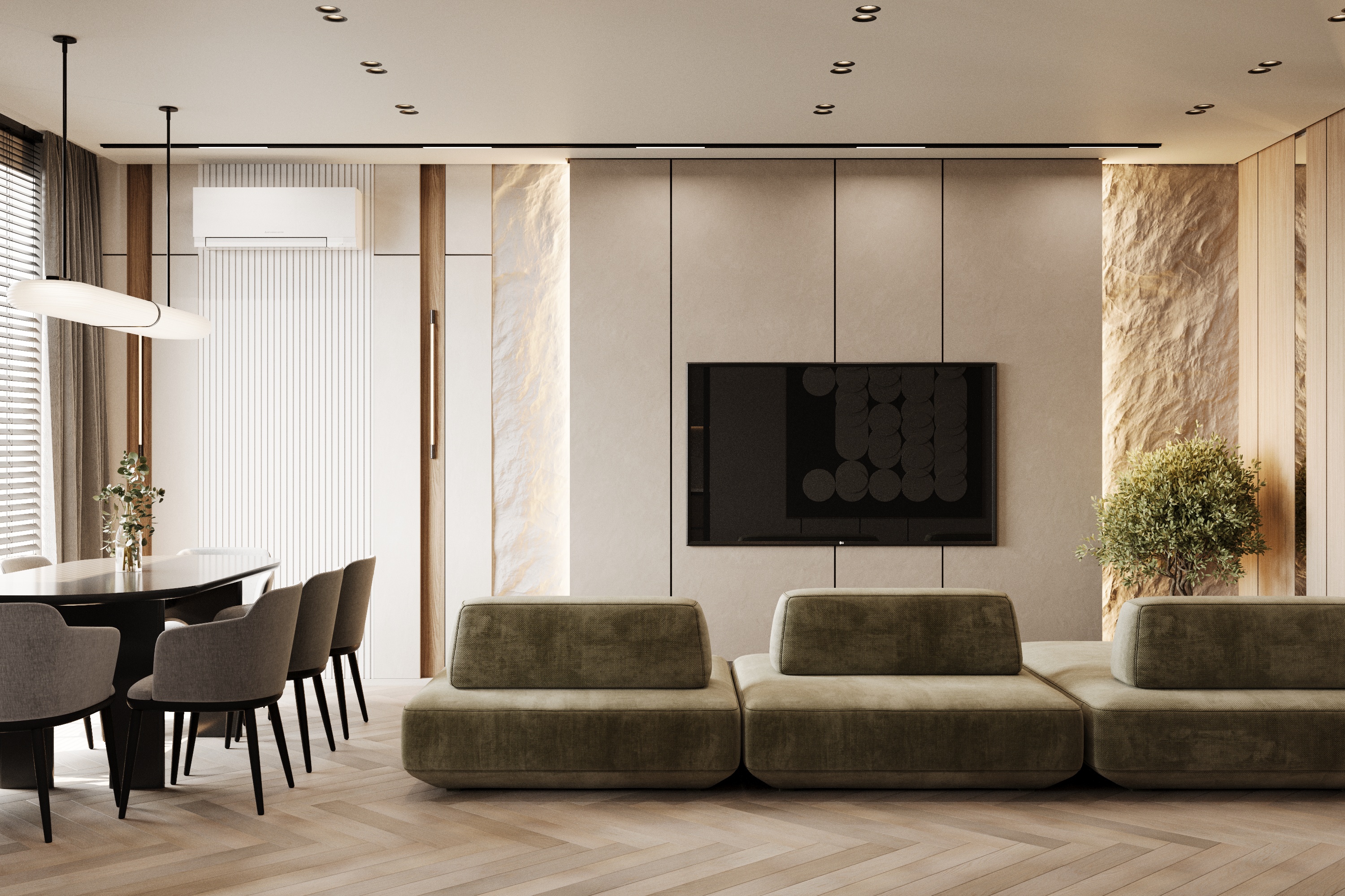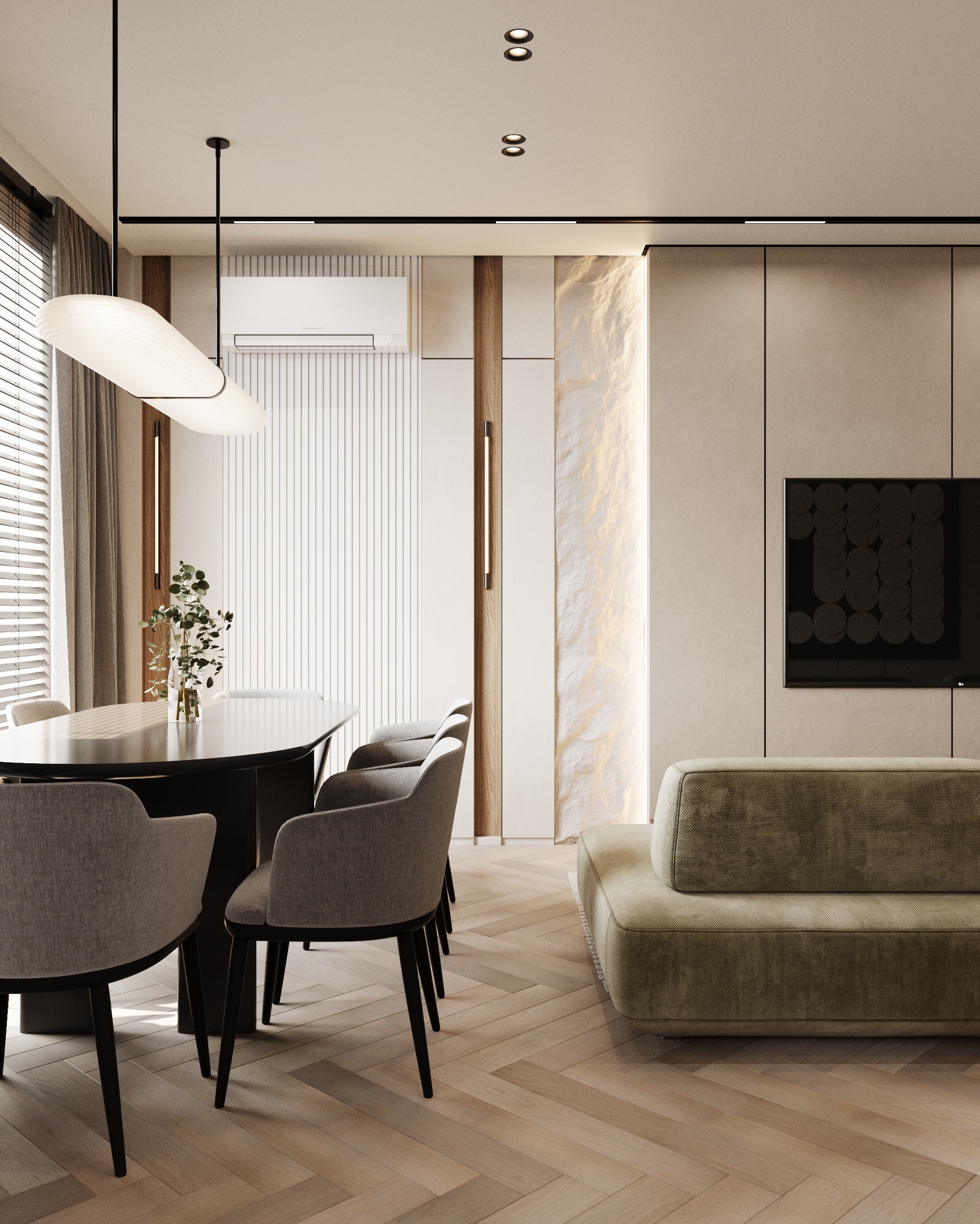 Интерьер выполнен в современном минимализме с элементами скандинавского и японского стиля