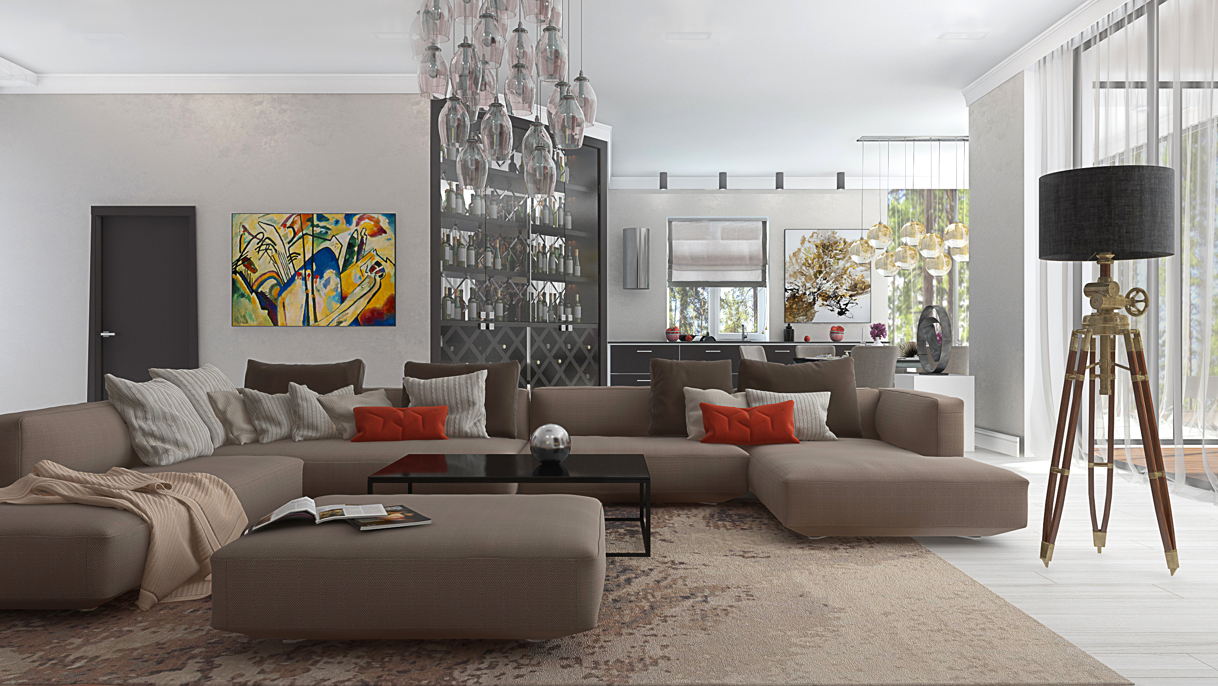 Торшер в полете, нету теней от стулов на полу, мало рефлекта в т.ч. на полу, диван летает, материал тюли, более реалистичный бы(не такой прозрачный, у вас там наверное рефракт даже лежит).
