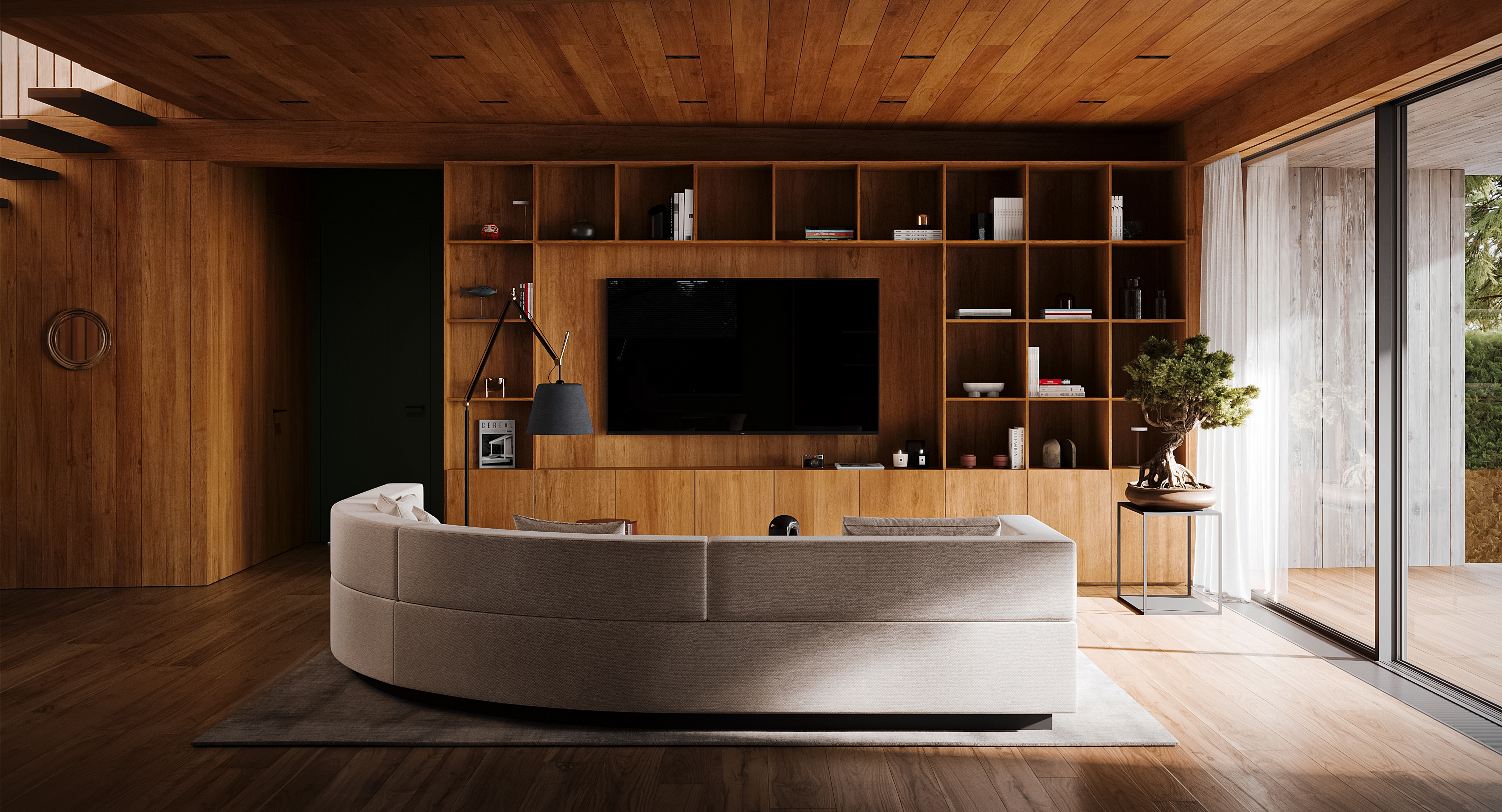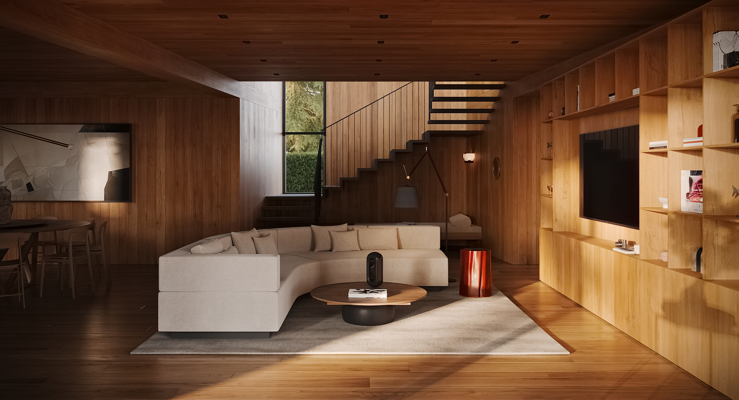 Дизайн и визуализация кухни-гостиной в загородном доме в лесу. 2025 г. 3ds Max, Corona Renderer, Adobe Photoshop