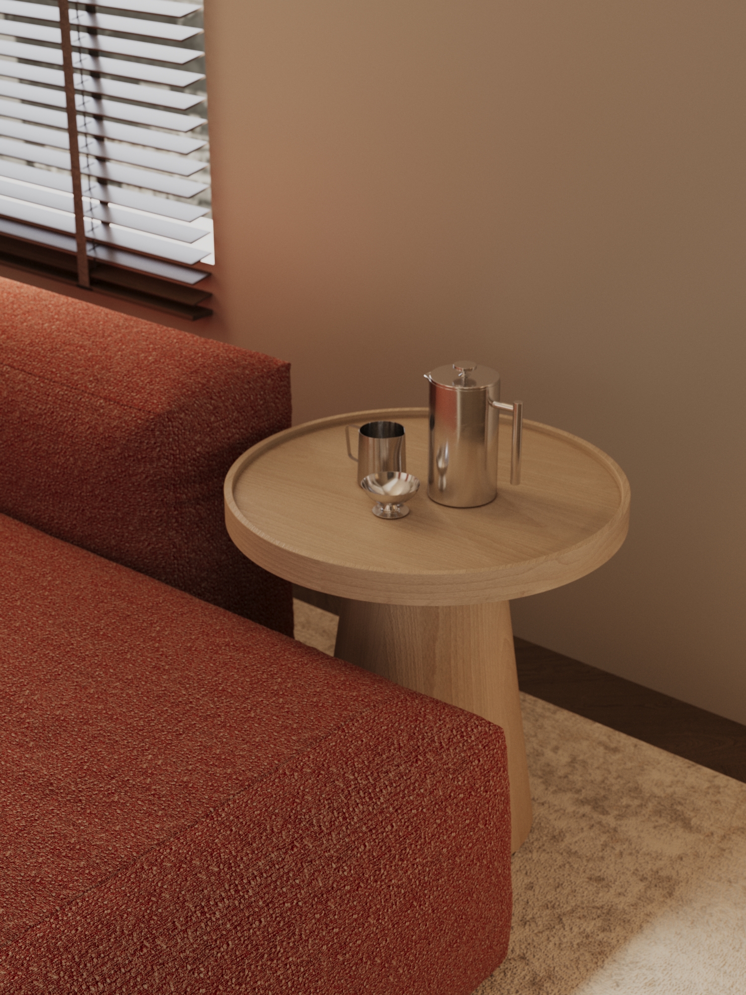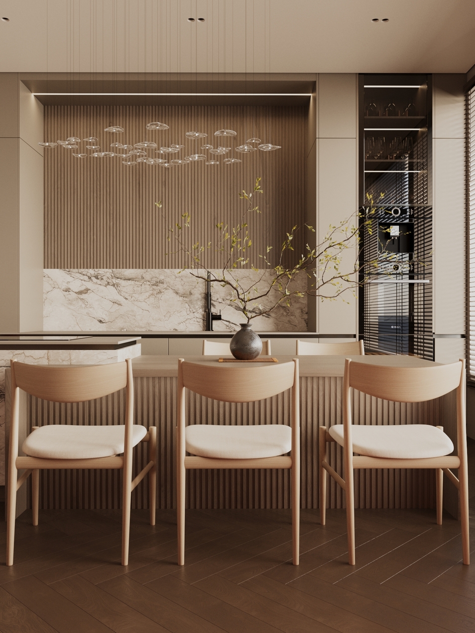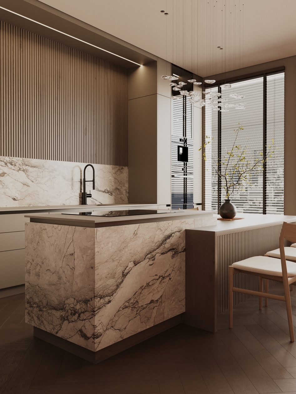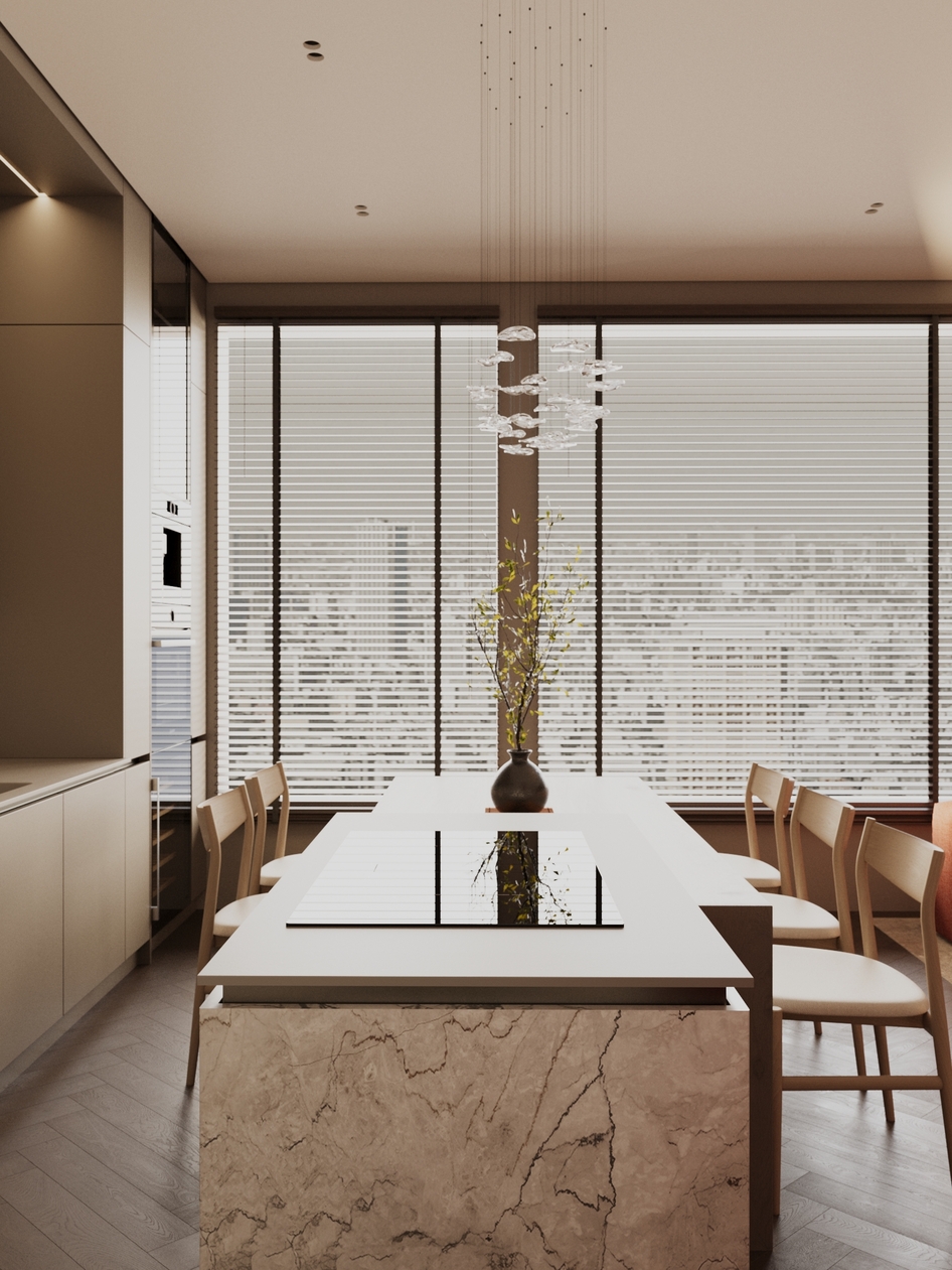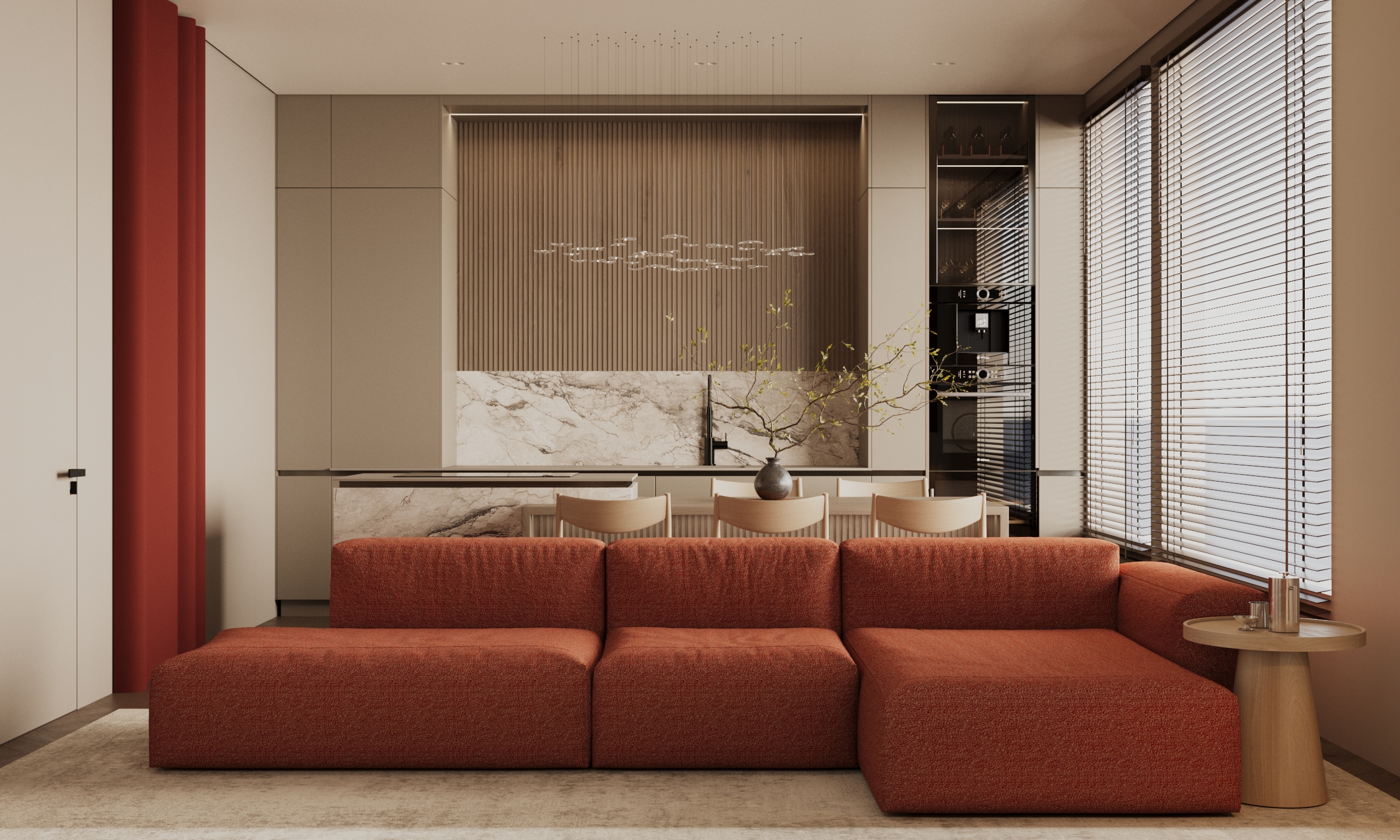 Кухня-гостиная с панорамными окнами и ярким акцентным цветом