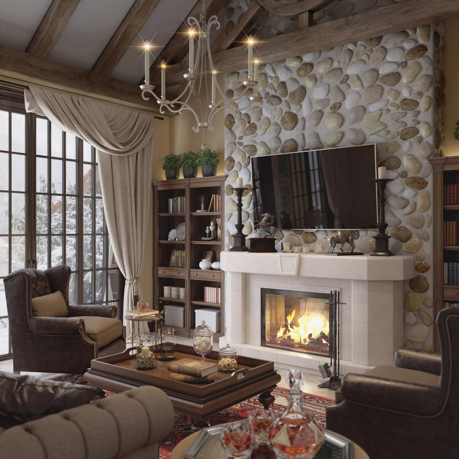Зачетное шале получилось, от себя скажу: только камень на облицовке камина поменял бы на более грубый и крупный, но это на вкус и цвет.
